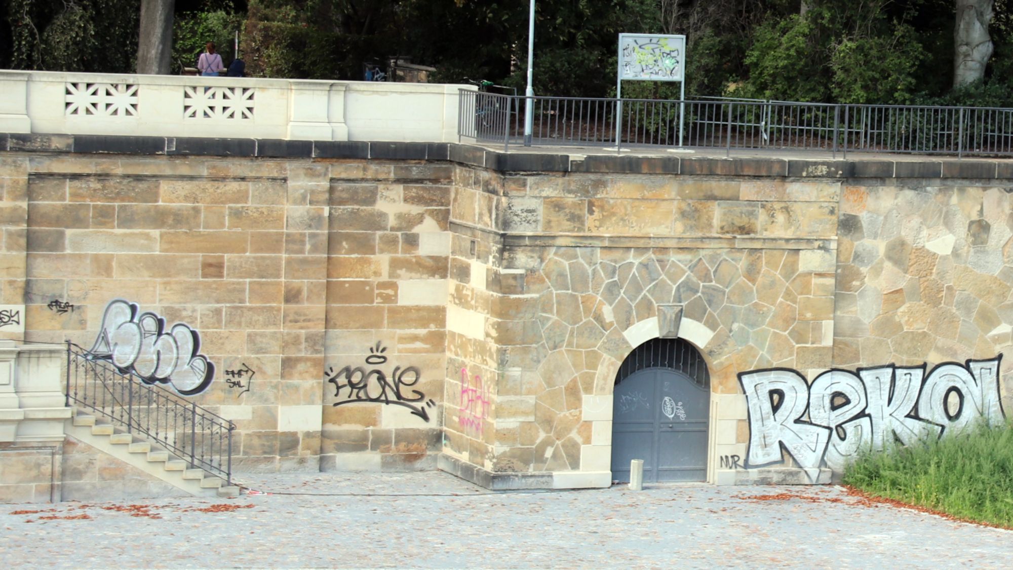 Einige der Graffiti am Elbufer in der Nähe der Albertbrücke sind offenbar schon so festgefressen, dass eine Entfernung sehr aufwändig ist. Erste Entfernungsversuche unterhalb des Bogenschützen wurden deswegen schon wieder abgebrochen.