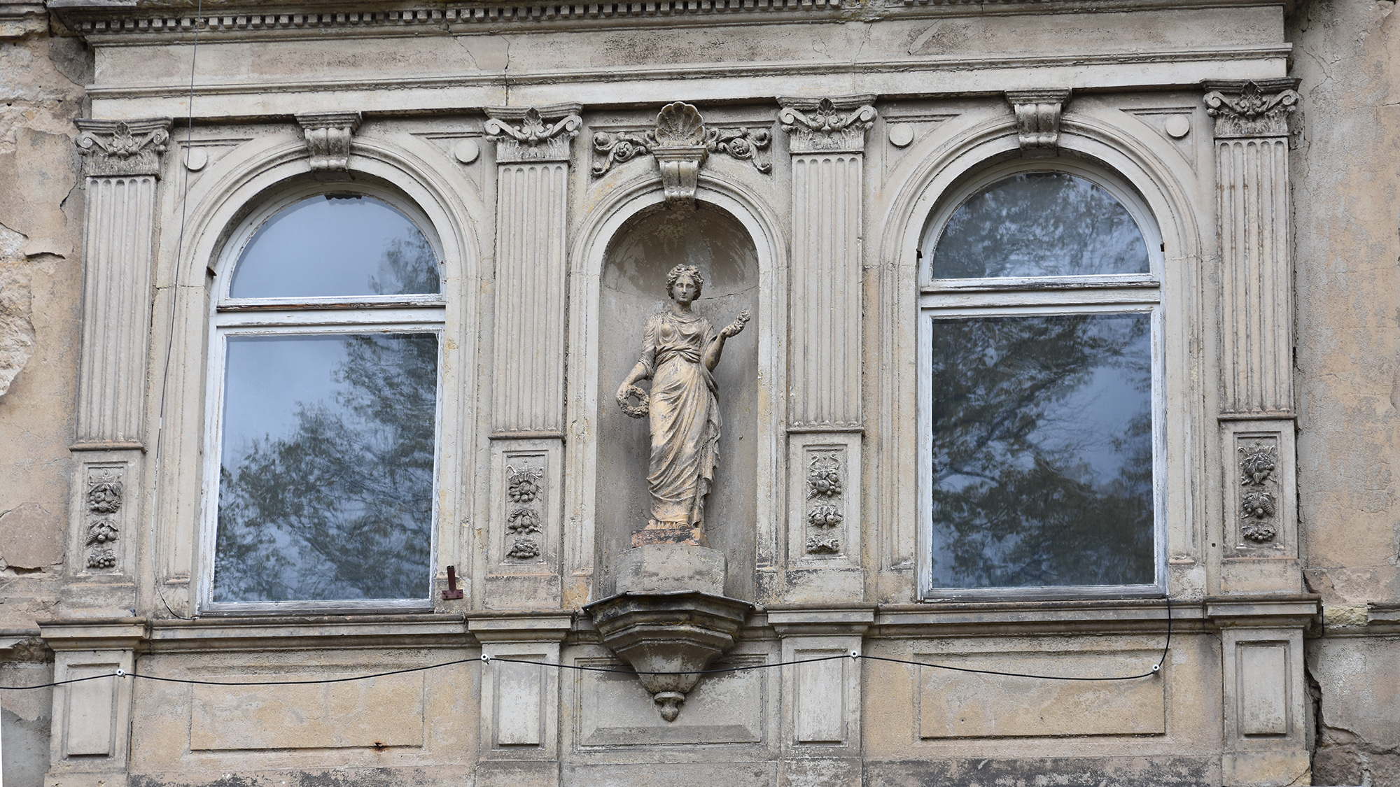 Das Ende der Straße stellt das zum Verkauf stehende Gebäude in der Jägerstraße 10 dar. Von einem Vorsprung des Hauses beobachtet eine Statue die wenigen Vorbeigehenden.