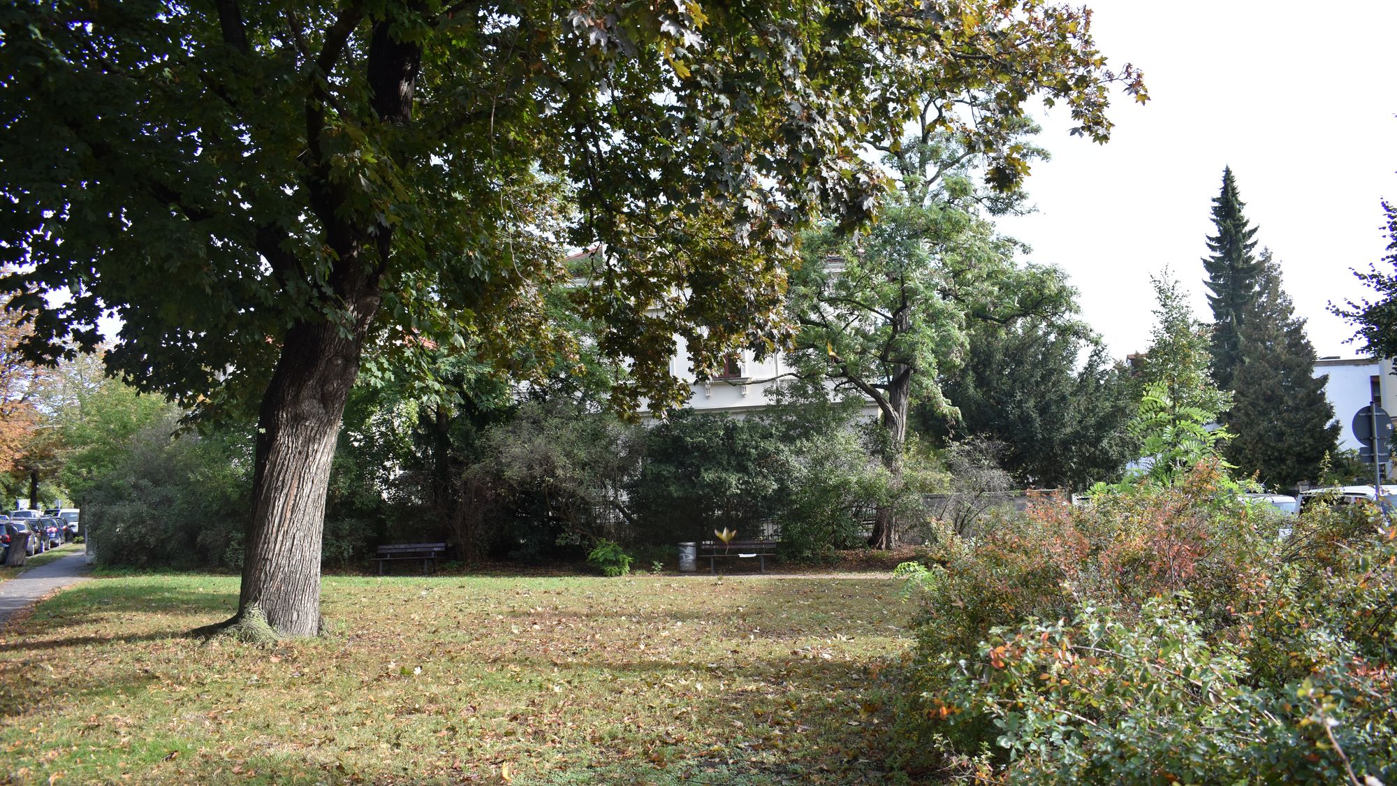 Von der Forststraße kommend, liegt links eine kleine unbebaute Wiese, die man trotz der zwei Bänke beim besten Willen nicht als Park bezeichnen kann, dafür ist das Fleckchen einfach zu klein. Im Hintergrund hört man lautstark Grundschulkinder spielen. Durch die Bäume schimmert das bunte Logo der Regenbogenschule. So wirkt das nicht unbedingt für seine Schönheit bekannte Gebäude etwas fröhlicher.