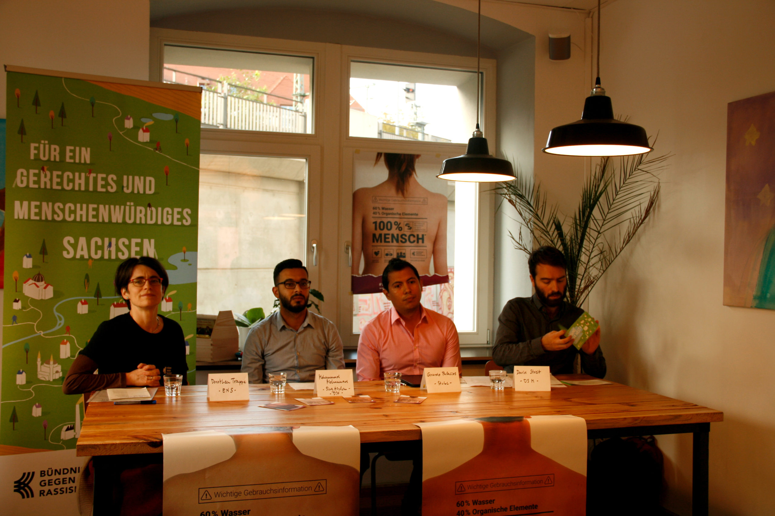 „Seit zwölf Jahren lebe ich in Deutschland, seit 2007 in Dresden und ich bemerke Veränderungen. Früher waren die meisten Menschen neugierig, kamen auf mich zu und stellten mir Fragen. Doch diese Neugier hat sich bei einigen Menschen in Angst verwandelt. Es gibt Menschen, die halten ihre Tasche fest, wenn sie mich sehen oder sie spucken mich an. Da habe ich beschlossen aktiv zu werden“, sagt Gerardo Palacios Borjas. Er ist Teil des Bündnisses „100 Prozent Mensch“.
