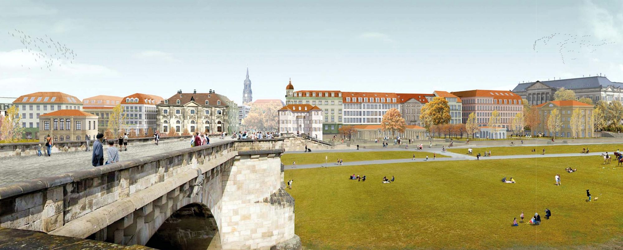 Im wesentlichen geht es darum, die freien Flächen neben der Augustusbrücke und zwischen dem Hotel Bellevue, dem Blockhaus und dem Japanischen Palais zu bebauen. In dem Siegerentwurf sind auch zwei Häuser direkt auf dem Neustädter Markt, also unmittelbar neben dem Goldenen Reiter vorgesehen.