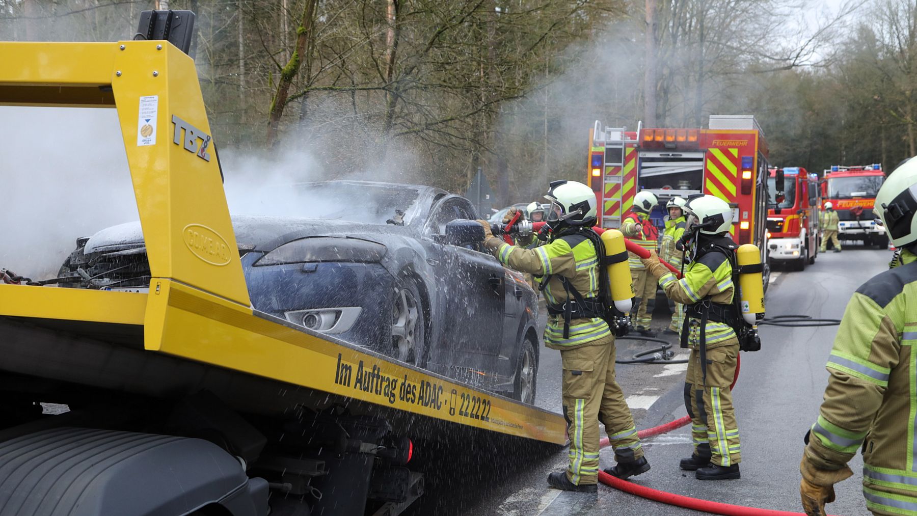 Anschließend wurde das Auto durch einen Abschleppdienst geborgen. Noch während des Abtransports begann der Kombi in Höhe der Heidemühle erneut zu brennen. Vermutlich hatte der Fahrtwind das Feuer wieder angefacht. Der Mitarbeiter des Abschleppdienstes bemerkte den Brand und hielt geistesgegenwärtig an.