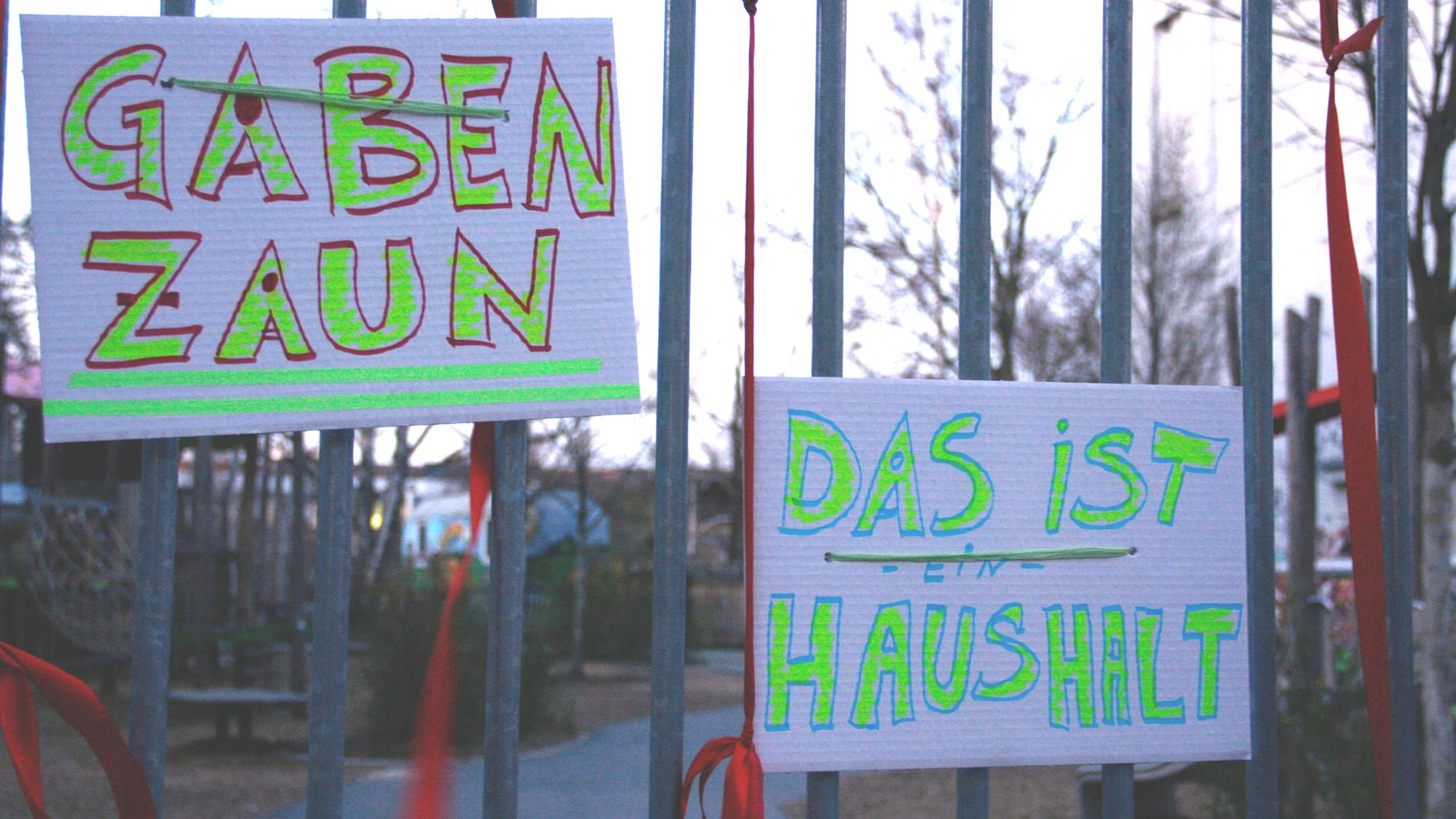 Mit dieser Aktion möchte die „Gruppe polar“ diesen Menschen eine Stimme geben und zu Solidarität aufrufen. „Solidarität heißt mehr als Abstand halten“, sagt Toni vom Bündnis „Recht auf Stadt“ und hängt eine Plastiktüte mit Obst, Schokolade und Hygieneartikeln an den Gabenzaun. Solidarität heiße eben auch die soziale Frage nicht auszublenden.