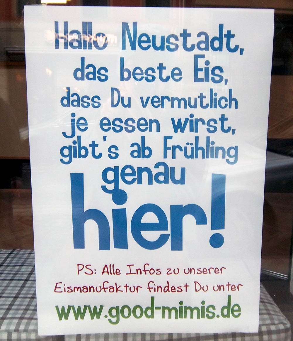 Pünktlich zur Eissaison öffnet auf der Alaunstraße 57 ein neuer Eisladen, der sich mit selbstgemachten Schlemmereien rühmt. Das „Good Mimi’s“ zieht in die alte Location des Nähladens „Stichpunkt“ ein. Die ersten Informationen, die sich auf der Website finden lassen, klingen für American-Icecream-Fans vielsprechend: Geschmacksrichtungen wie Vanille-Karamell-Brownie, OREO-Keks, Vanille-Honig, Banana-Walnut oder Mocha-Tiramisú lassen das Herz des Zuckerjunkies höher schlagen.