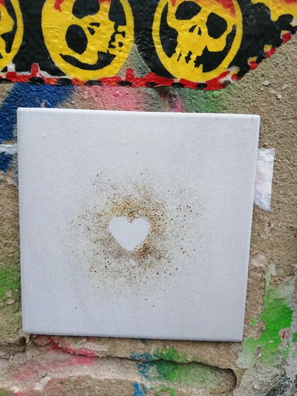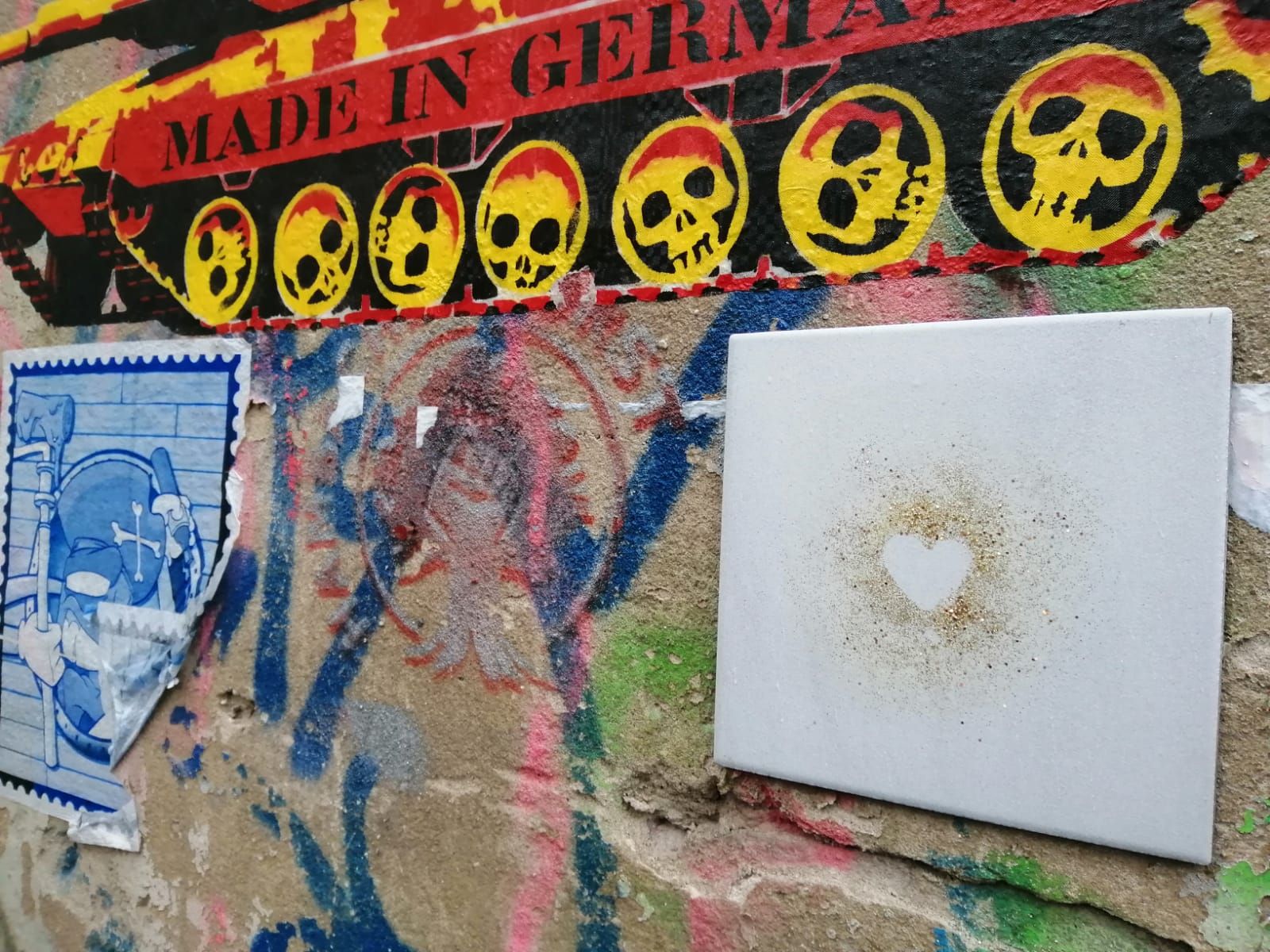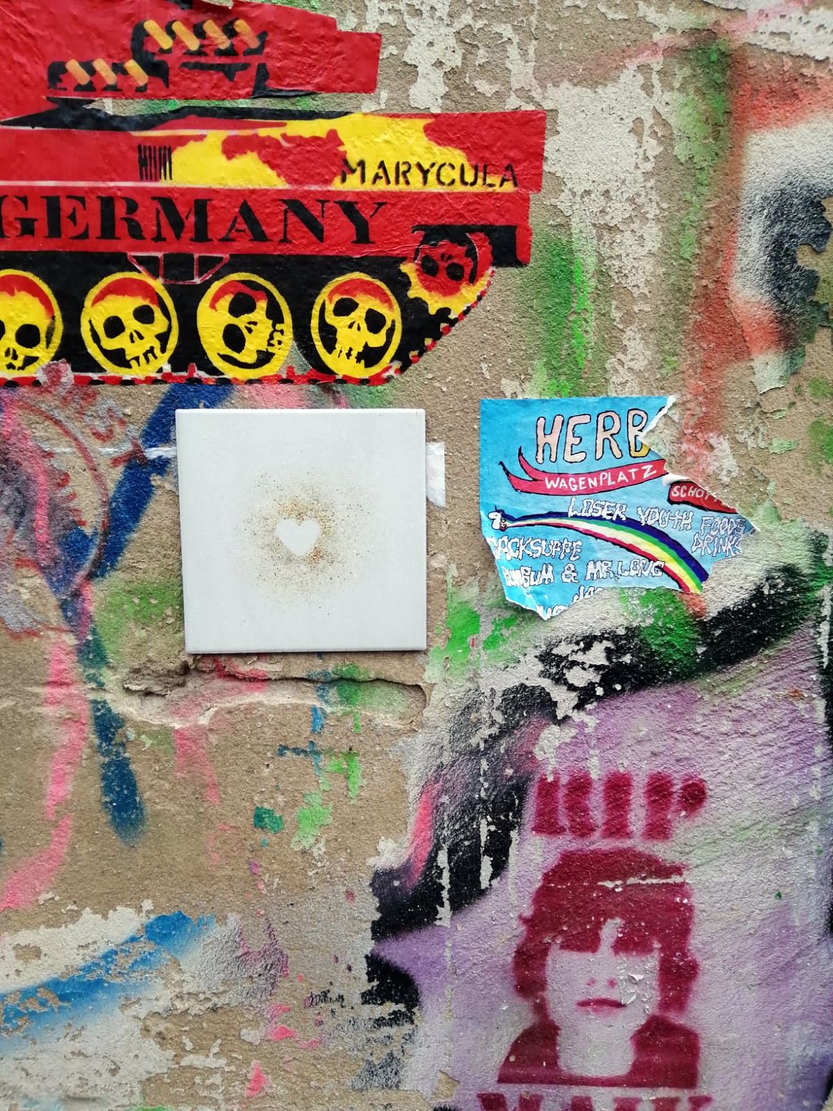 Eingang Julie-Salinger-Weg, neben dem Raskollnikoff, an der Ecke Böhmische Straße. Ein großer aufgeklebter Panzer verziert die halbe Wand und zieht die Blicke mittels leuchtendem Rot auf sich. Unscheinbar und doch liebevoll behauptet sich eine weiße Fliese mit goldenem Herzen.