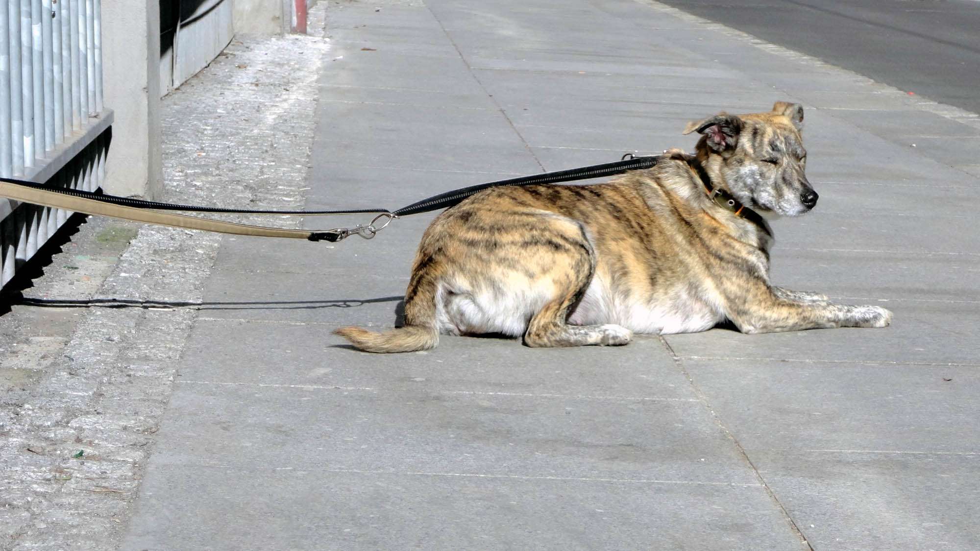 Da muss sich maximal der Tierschutz kümmern. Der Besitzer ist im Asia-Imbiss gegenüber zu finden. Bierchen trinken. Die Hündin wartet manchmal mehrere Stunden. Solang, wie Herrchen eben braucht.