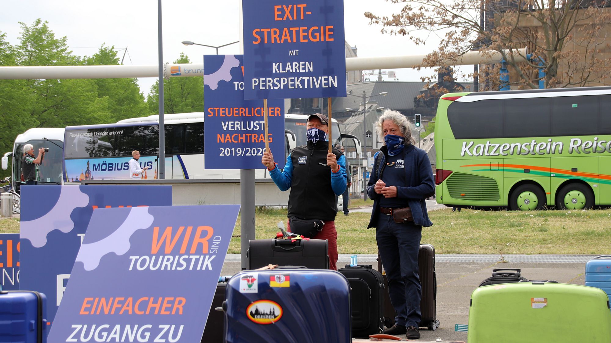 Gestern vorm Sächsischen Landtag. Die Reisebranche hat zur Demo aufgerufen. Ein paar Koffer sind abgestellt. 50 Reisebusse fahren hupend im Kreis und die für den Bereich Kultur und Tourismus zuständige Ministerin Barbara Klepsch (CDU) ist im Gespräch mit den Vertretern der Branche. Sie will sich dafür einsetzen, das Sofortzuschussprogramm des Bundes um weitere Monate zu verlängern und zudem für Unternehmen mit bis zu 50 Beschäftigten zu öffnen. Außerdem erklärte sie, dass man in Sachsen an einem Stufenplan zu möglichen Lockerungen im Tourismus arbeite.