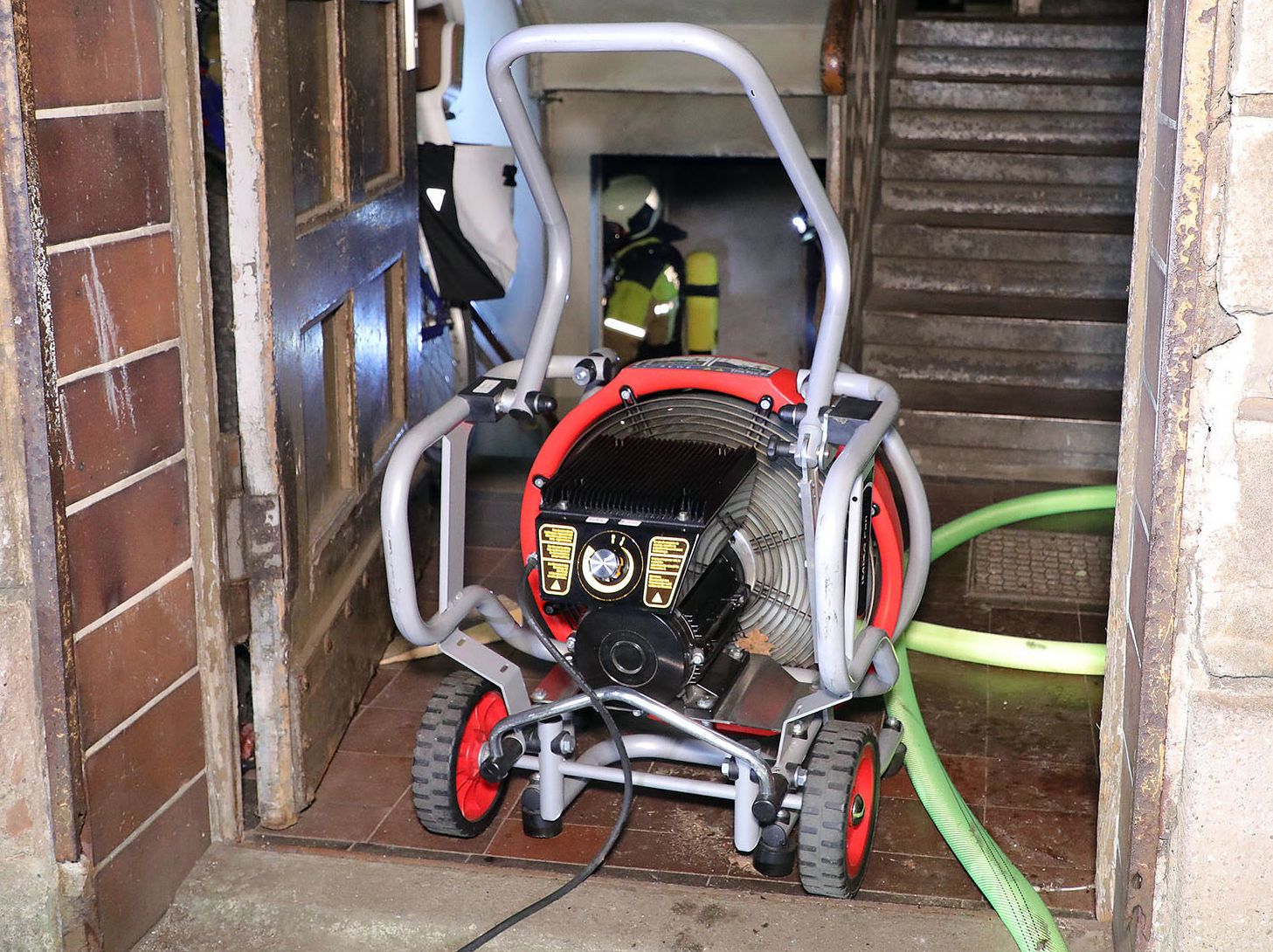 Aus bislang unbekannter Ursache hatte sich Sperrmüll in einer Kellerbox entzündet. Angaben zum Sachschaden liegen derzeit nicht vor. Die Kriminalpolizei ermittelt wegen Brandstiftung. Ein Überdrucklüfter im Einsatz. Foto: Roland Halkasch