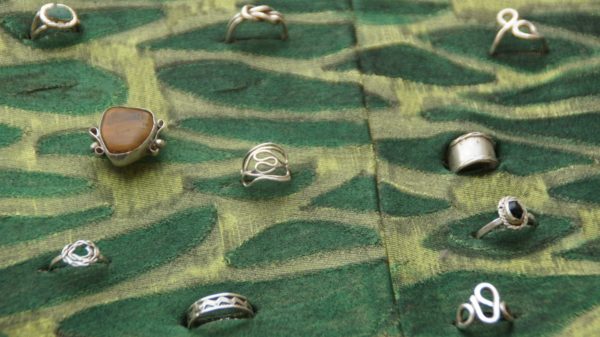 In den samtenen Präsentationskästen in den Regalen liegen zu 70 Prozent Handarbeiten von Ruben Torres. Ihn freut es, sagt er, dass den deutschen Kund*innen seine handgemachten Ringe, Kettenanhänger und Ohrringe besser gefallen als die professionellen Schmuckstücke aus seiner Heimat. Nach seinem Schulabschluss wurde Ruben Torres Künstler und Percussionist. Er reiste umher und arbeitete etwa zwanzig Jahre lang auf der Straße. Immer neue Orte, neue Menschen. Während wir sprechen, biegt er aus Aluminiumdraht meinen Namen als silbernen Schriftzug, elegant verziert mit einer Schnecke.
