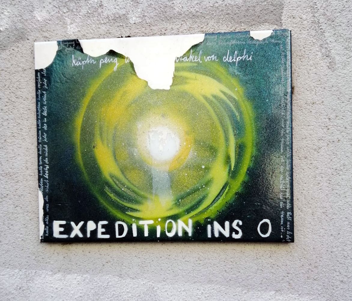 Unmittelbar im Hof der Tiere in der Kunsthofpassage, neben dem Feng-Shui-Haus, befindet sich diese grüne Fliese. Die „Expedition ins O“ ist leider schon etwas verschlissen, so dass sich die lyrischen Inschriften nicht mehr so richtig entziffern lassen. Somit bleibt unklar, welche Rolle Käptn Peng in Delphi gespielt hat und was mit dem Satz: „alles was du siehst besitzt du nicht“ gemeint ist.