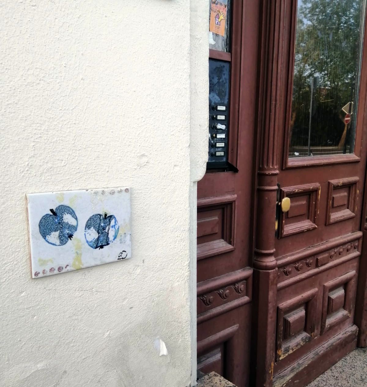 Vielen gilt die Alaunstraße und der Albertplatz gewissermaßen als Tor zur Äußeren Neustadt. Klar, hier kommen abends die Vergnügungswilligen an und streben von der Straßenbahn in die Bars und Kneipen. Den wenigsten wird diese wunderbare Fliese bislang aufgefallen sein. Denn dafür muss man ein paar Schritte von der Ideal-Linie abweichen und in die sogenannte „Kleine Bautzner Straße“ schwenken. Dann befinden sich die zwei blauen Äpfel jedoch gut sichtbar auf Augenhöhe.