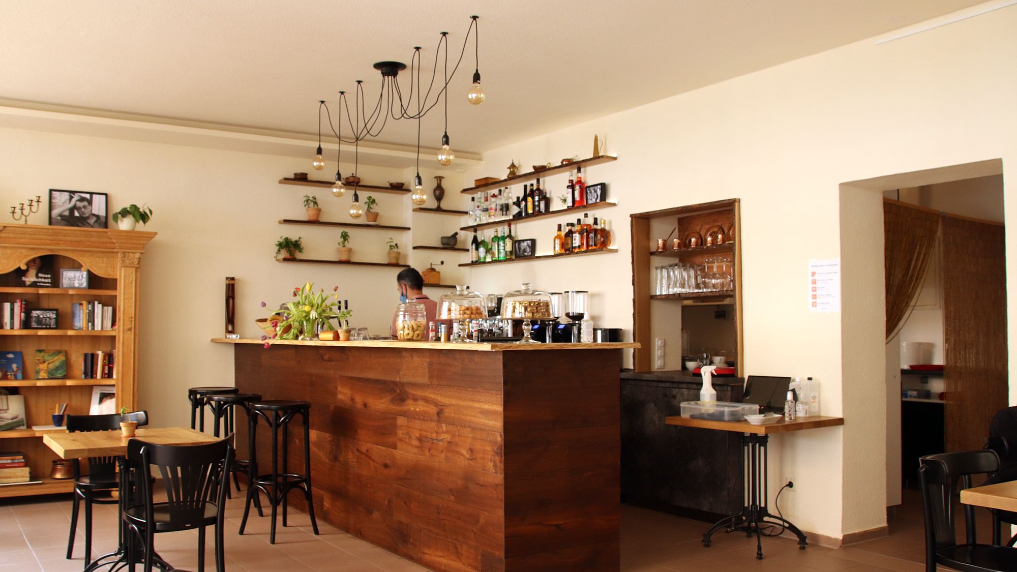 Die drei jungen Syrer haben den Laden ordentlich umgekrempelt, an den Wänden finden sich Schwarz-Weiß-Fotos arabischer Künstler und Musiker. „Wir wollen hier ein Café etablieren, fernab der Klischees“, sagt Muhannad. Zu den frisch zubereiteten und weniger bekannten orientalischen Spezialitäten zu jeder Tageszeit (z.B. Manaqish, Fruchtcocktails, Süßigkeiten und Getränke) wird lokal gerösteter Kaffee gereicht. Neben Musik soll es auch Lesungen und Ausstellungen geben. Im großen Bücherregal liegt auch reichlich Literatur für die Gäste.