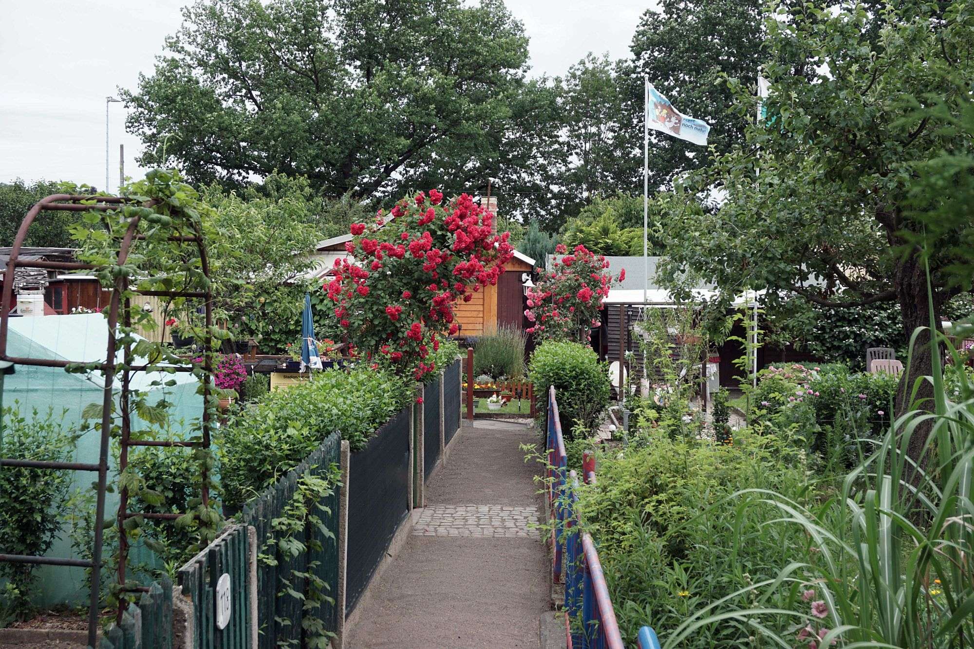 Dahinter gibt die S-Bahnbrücke den Vorhang frei für eine ganz besondere Spezies in der Gattung der Freizeitdomizile: die Kleingärten. Hier trifft das Kleinbürgertum auf Urban Gardening. Mehrere Gartensparten mit klangvollen Namen wie Erholungsland oder Morgensonne reihen sich nahtlos aneinander und werden von endlosen geraden, von Hecken gesäumten Wegen strukturiert.