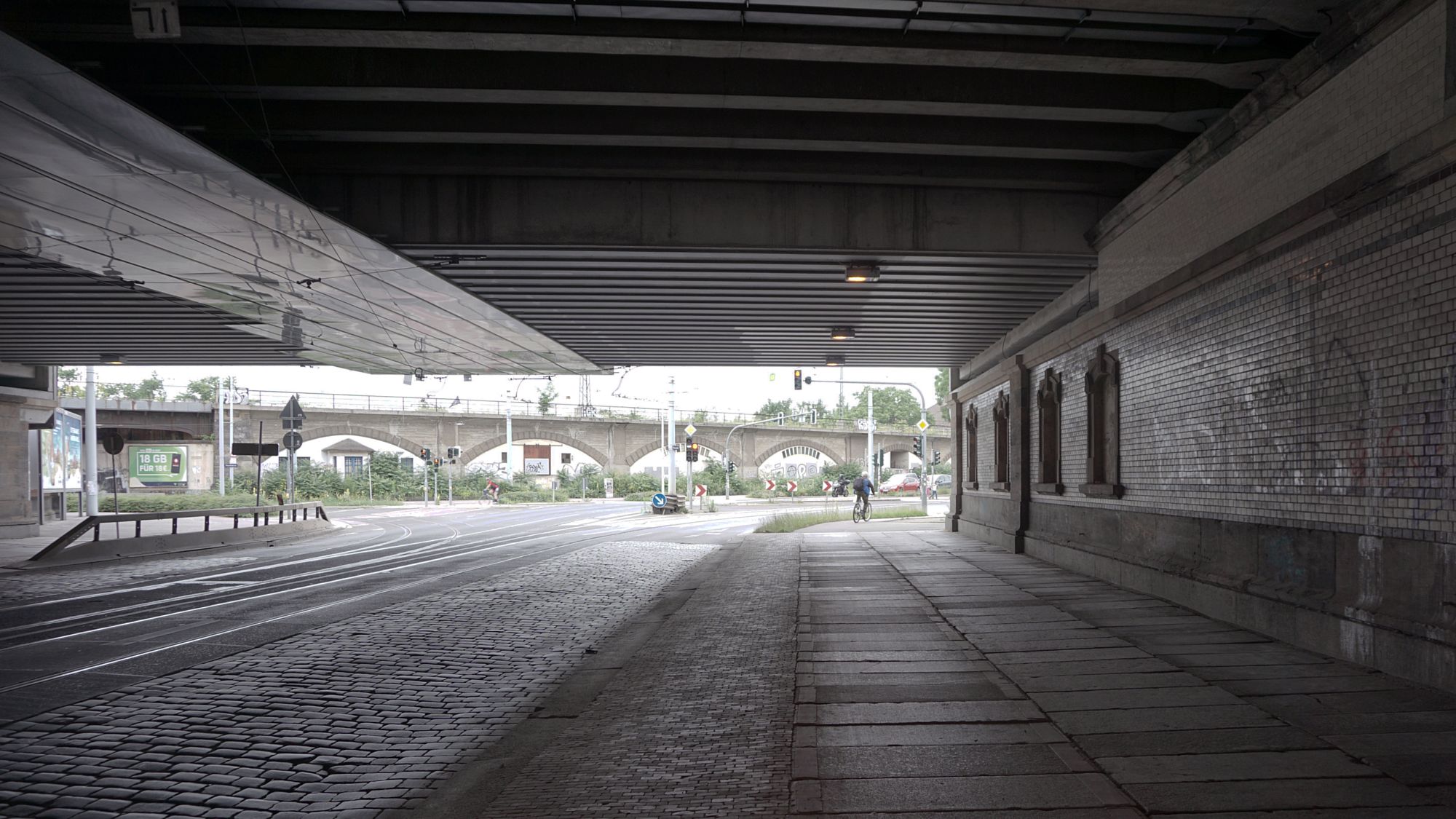 An der Gabelung zur Großenhainer Straße verabschiedet sich die Straßenbahn und überlässt den Grünstreifen in der Mitte den Bäumen und einem kleinen Trampelpfad.