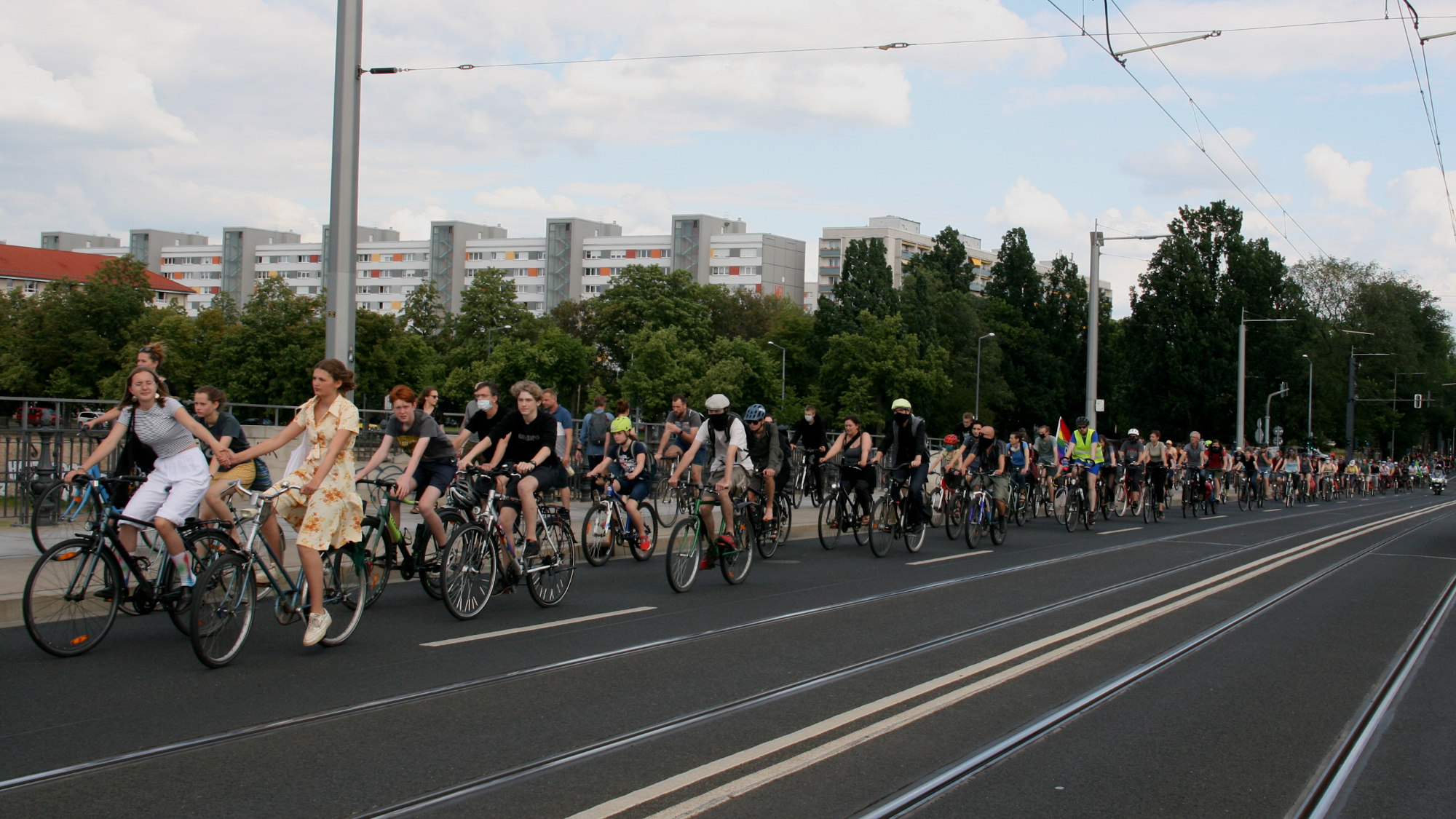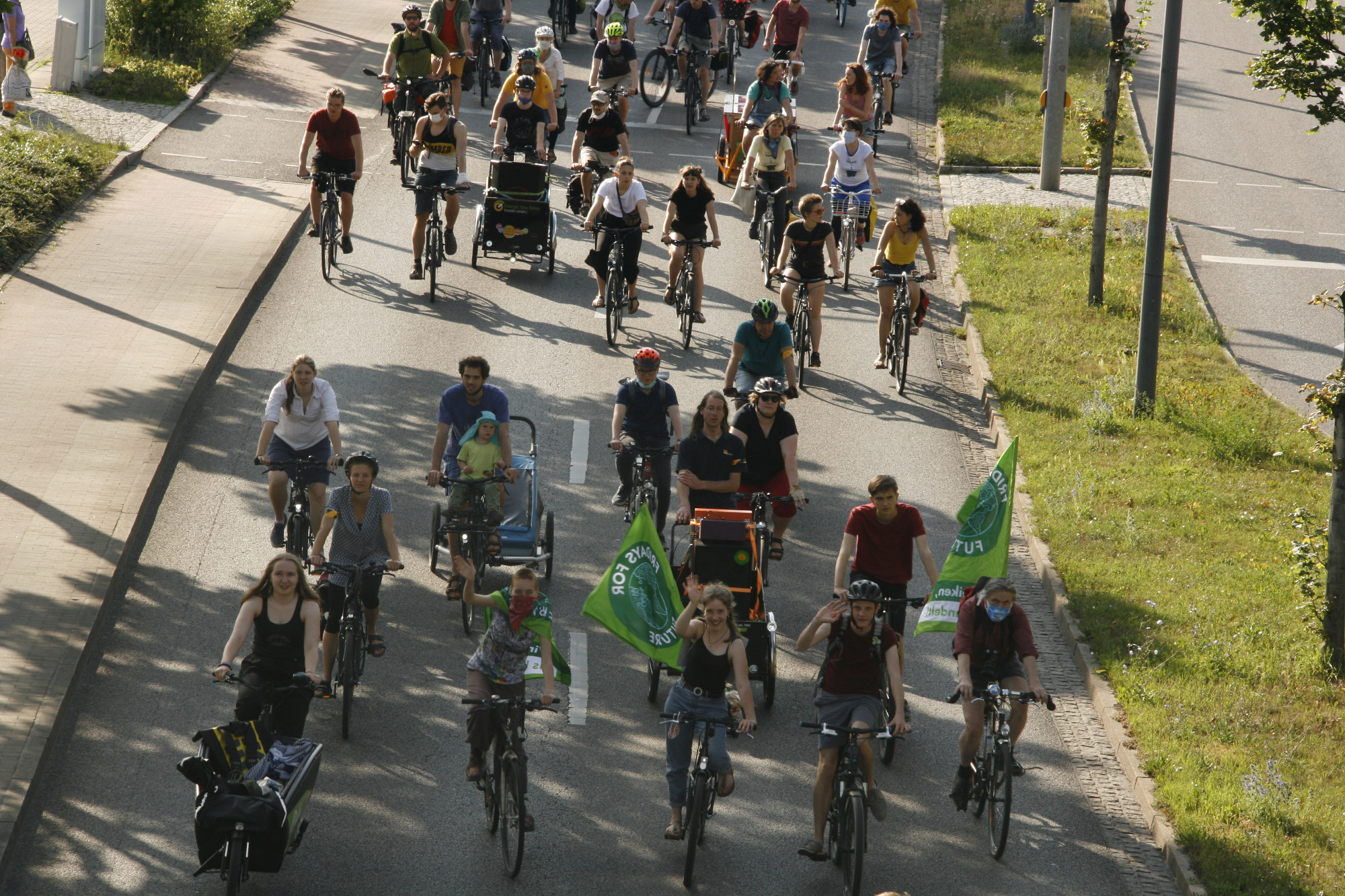 Rund 600 demonstrierten mit dem Fahrrad am Freitag durch die Dresdner Innenstadt. Sie fordern eine Verkehrswende und einen baldigen Kohleausstieg.