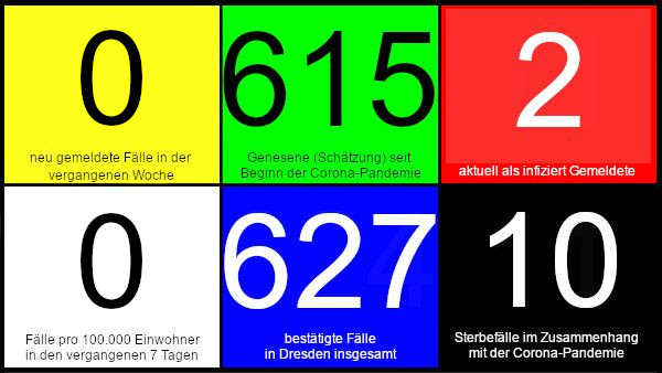 In Dresden gab es nun seit zwölf Tagen keine neu gemeldete Infektion mehr. Jedoch befinden sich weiterhin zwei Infizierte im Krankenhaus. Deutschlandweit werden trotz der Lockerungen und der beginnden Reisezeit nur wenige Neuinfektionen gemeldet. Weltweit breitet sich der Virus jedoch weiter aus. Inzwischen wurden weltweit mehr als elf Millionen Infektionen gemeldet, und mehr als eine halbe Million Todesfälle. In der vergangenen Woche ist die Anzahl der Neuinfektionen wieder gestiegen, Details in der Übersicht der Johns-Hopkins-Universität.