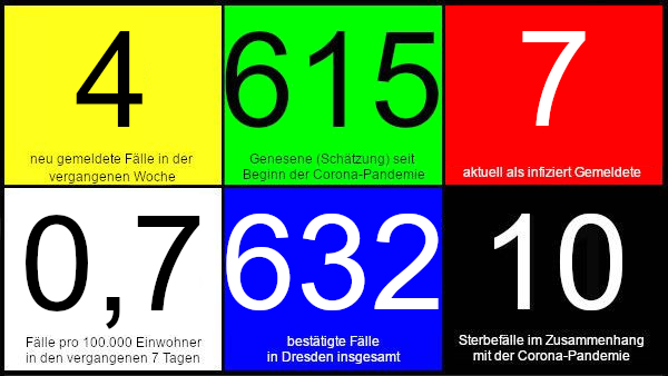 In Dresden wurden in der vergangenen Woche vier Neuinfektion gemeldet. Im Interview mit der Sächsischen Zeitung erklärte Sozialbürgermeisterin Kristin Kaufmann am Mittwoch, dass es sich bei den letzten Fällen um Urlaubsrückkehrer gehandelt habe. Ob das auch für die aktuellen Fälle zutrifft, kann derzeit noch nicht gesagt werden.