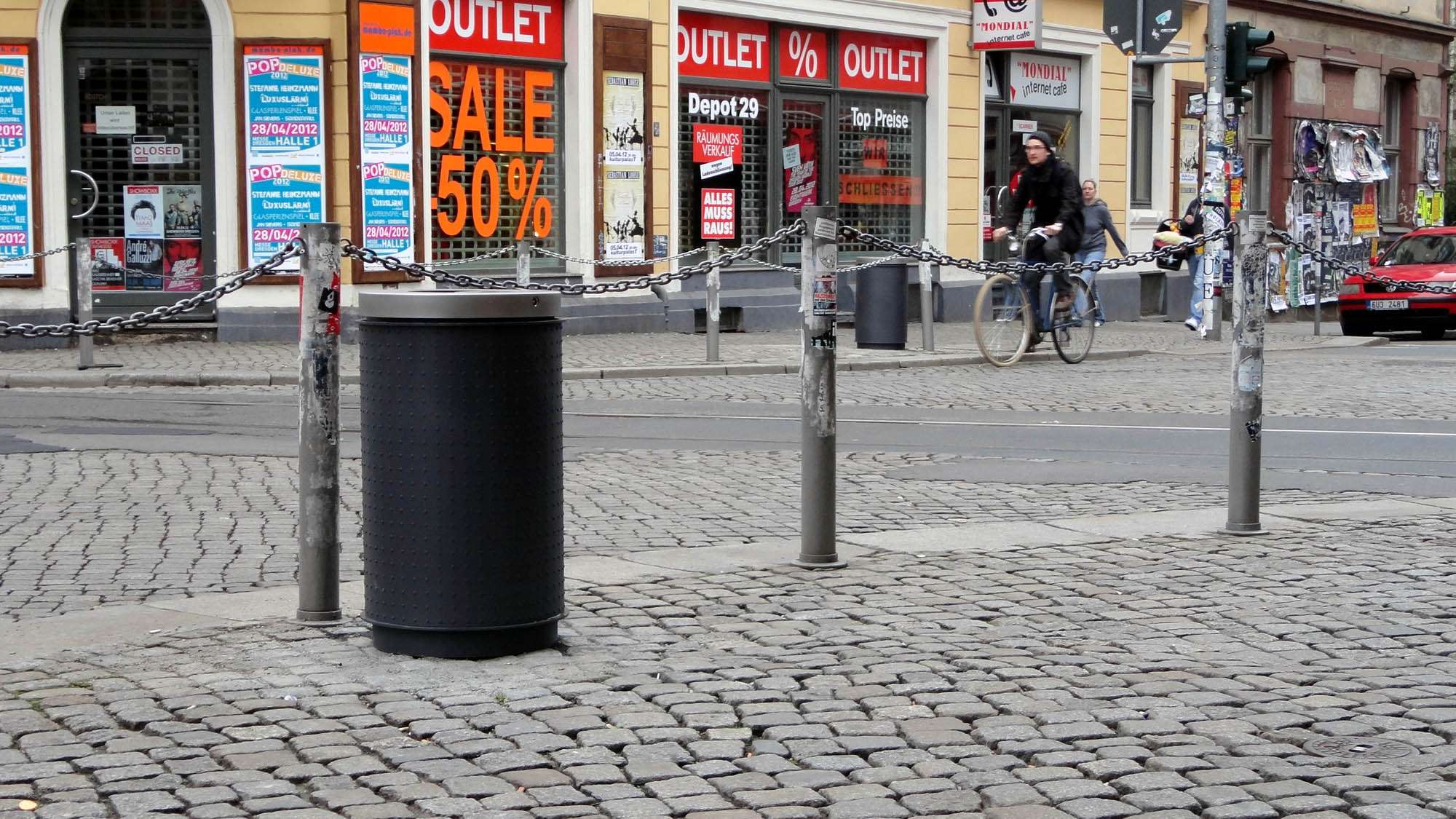 Die Neustadt bekommt pünktlich zum Osterfest Papierkörbe geschenkt. Heute morgen konnte ich vier der massiven Stahl-Eimer auf der Louisenstraße besichtigen. Gestern im Laufe des Tages wurden die Müllbehälter aufgestellt. Sie sind massiv im Boden eingelassen und können nicht einfach umgestoßen werden. Noch sehen sie sehr jungfräulich aus. Keine Aufkleber, kein Graffiti.