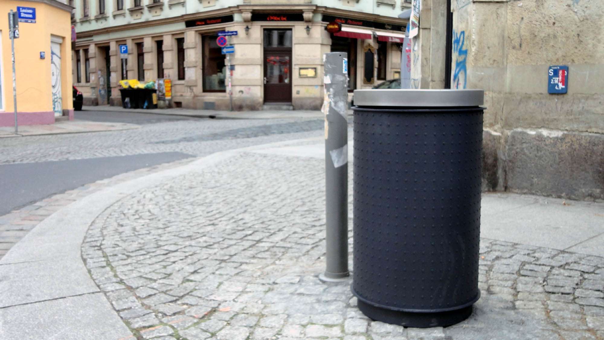 Am Meinel-Eck (Louisen-/Ecke Görlitzer Straße) stehen gleich zwei. Heute vormittag war einer schon recht gut gefüllt. Sogar der Kippenausdrücker wurde benutzt.