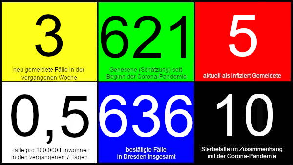 In Dresden wurden in der vergangenen Woche drei Neuinfektion gemeldet. Nach der Schätzung des Gesundheitsamtes sind in der vergangenen Woche drei Personen genesen. Weltweit sind inzwischen mehr als 17 Millionen Infizierte gemeldet, mehr als 670.000 Todesfälle wurden in Zusammenhang mit Covid-19 verzeichnet, Details in der Übersicht der Johns-Hopkins-Universität. Auch in Deutschland sind die Meldungen wieder etwas angestiegen, allerdings hat auch die Anzahl an durchgeführter Tests zugenommen.