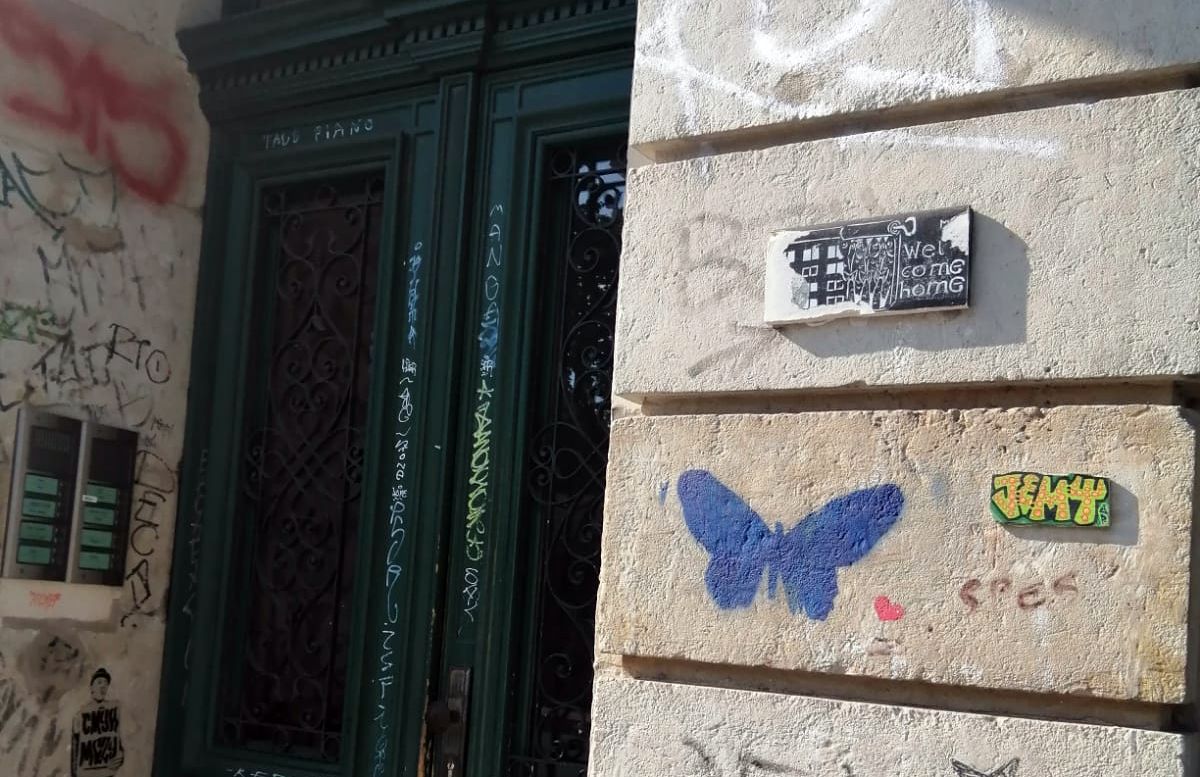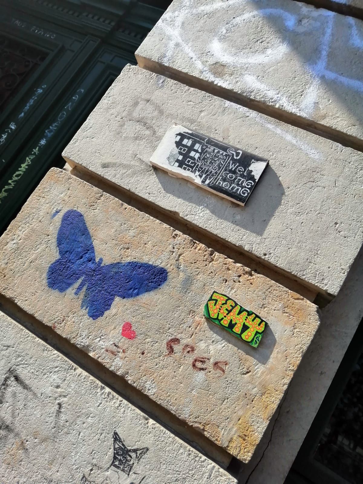 Am Bischofsweg, direkt an der Haltestelle Alaunplatz ist diese kleine Fliese zu sehen. Ihre ursprüngliche Botschaft „Welcome home“ – „Willkommen zu Hause“, ein Spruch mit dem länger Verreiste gern wieder begrüßt werden, ist noch zu erkennen. Gelitten hat das Haus auf der linken Seite. Dabei wurde es extra mit einer Rolltapete mit Blümchenmuster verziert. Interessant an der Fliese ist die zurückhaltende schwarz-weiß-Gestaltung und das außergewöhnliche Querformat. Flankiert wird sie von einem Schmetterling und Jemy.