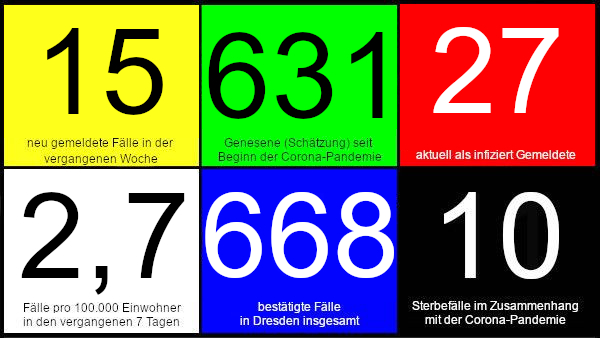 In Dresden wurden in der vergangenen Woche 15 Neuinfektion gemeldet. Nach der Schätzung des Gesundheitsamtes sind in der vergangenen Woche vier Personen wieder genesen. Weltweit sind inzwischen mehr als 23 Millionen Infizierte gemeldet, mehr als 800.000 Todesfälle wurden in Zusammenhang mit Covid-19 verzeichnet, Details in der Übersicht der Johns-Hopkins-Universität.