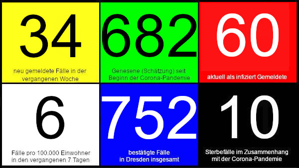 Am Sonntag, dem 13. September zeigt die Ampel weiterhin Grün mit dem Wert 6,0. Zur Verdeutlichung: Bund und Länder hatten sich auf einen Wert von 50 geeinigt, bei dem die Maßnahmen wieder verschärft werden müssen. Dieser Wert wird aktuell bundesweit im Landkreis Garmisch-Partenkirchen überschritten. Eine gute grafische Übersicht gibt es auf zeit.de. In Dresden wurde dieser Wert seit Beginn der Pandemie noch nie erreicht.