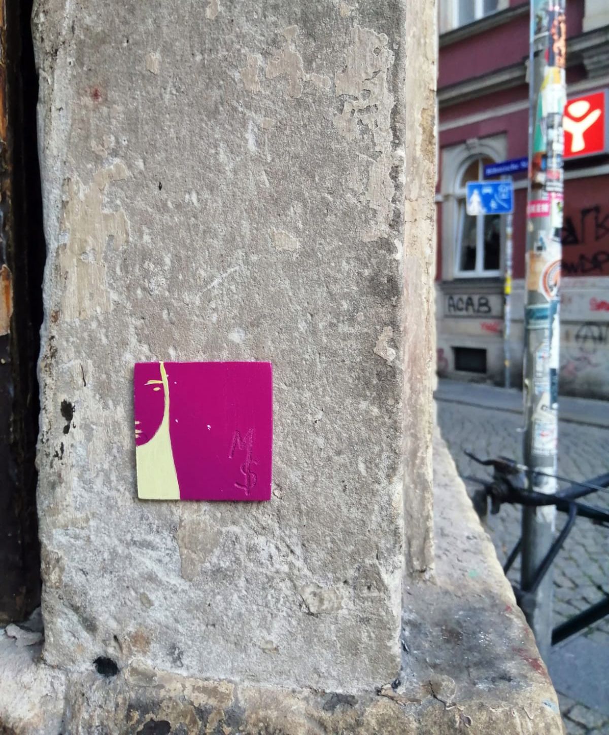 Die heutige Fliese versteckt sich im unteren Bereich des Eingangs der Familien-Einkehr „Hebedas“. Tür und Wand sind über und über mit Aufklebern und Tags verziert. Da fällt die recht kleine Fliese erstmal gar nicht besonders auf. Dabei ist die überwiegend rot gestaltete Fliese einen zweiten Blick wert. Dann erkennt man am linken Rand ein Gesicht mit ziemlich weiblichen Zügen. Dazu das Signet MS.