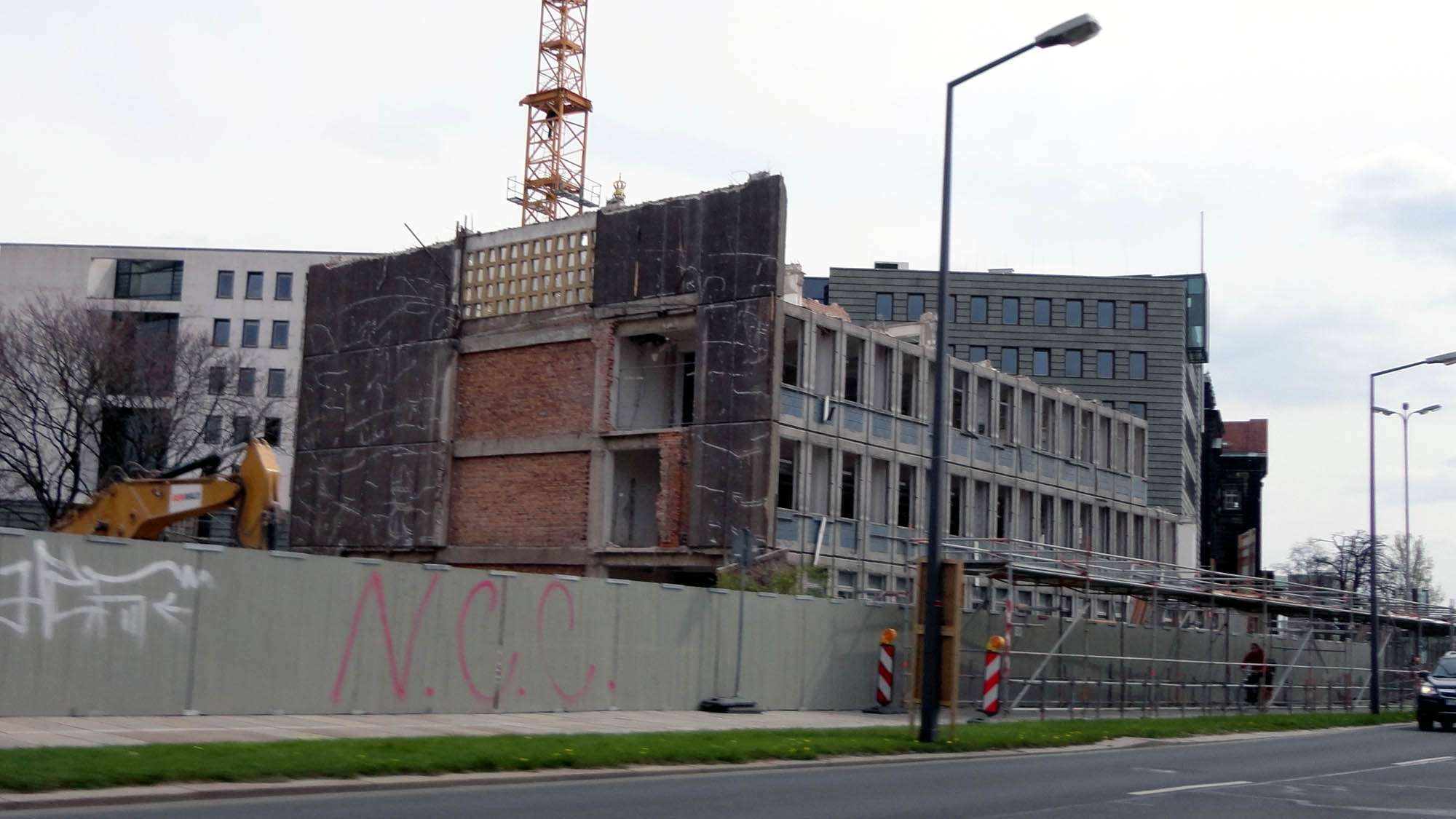Das Hochhaus am Carolaplatz ist Geschichte. Inzwischen sind die Planen gefallen und nur die untersten Stockwerke stehen noch.