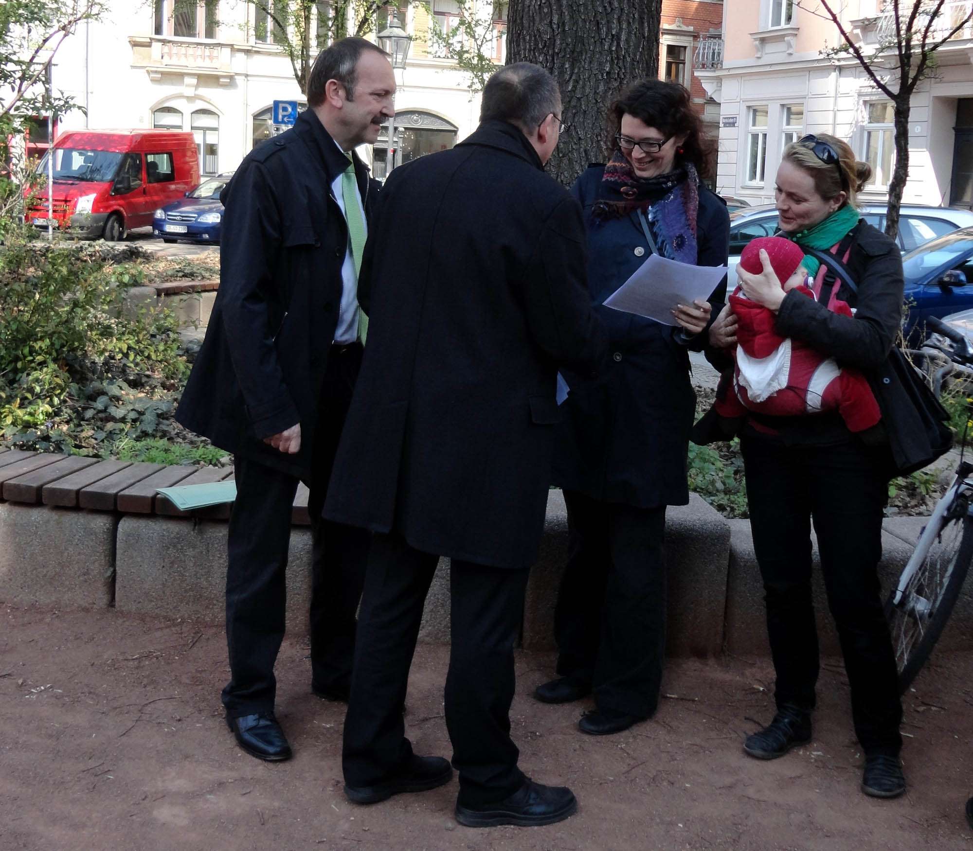 Offiziell vom Amt präsentiert wurde die Aktion heute Vormittag durch Detlef Thiel, Amtsleiter Amt für Stadtgrün und Abfallwirtschaft und dem Neustädter Ortsamtsleiter Andrè Barth am Martin-Luther-Platz. Nach einer Begrüßung und Dankesworten, die unter anderem auch an Ulla Wacker gingen, welche Anwohner informierte und um Paten warb, gab es für die ersten Baumpaten Oksana Rucker und Silvia Saupe, Vertreter einer Hausgemeinschaft auf der Schönefelder Straße, Jan Frintert, Sprecher des Gewerbe und Kulturvereins Dresden Neustadt und den Pfarrer Eckerhard Möller eine Urkunde.