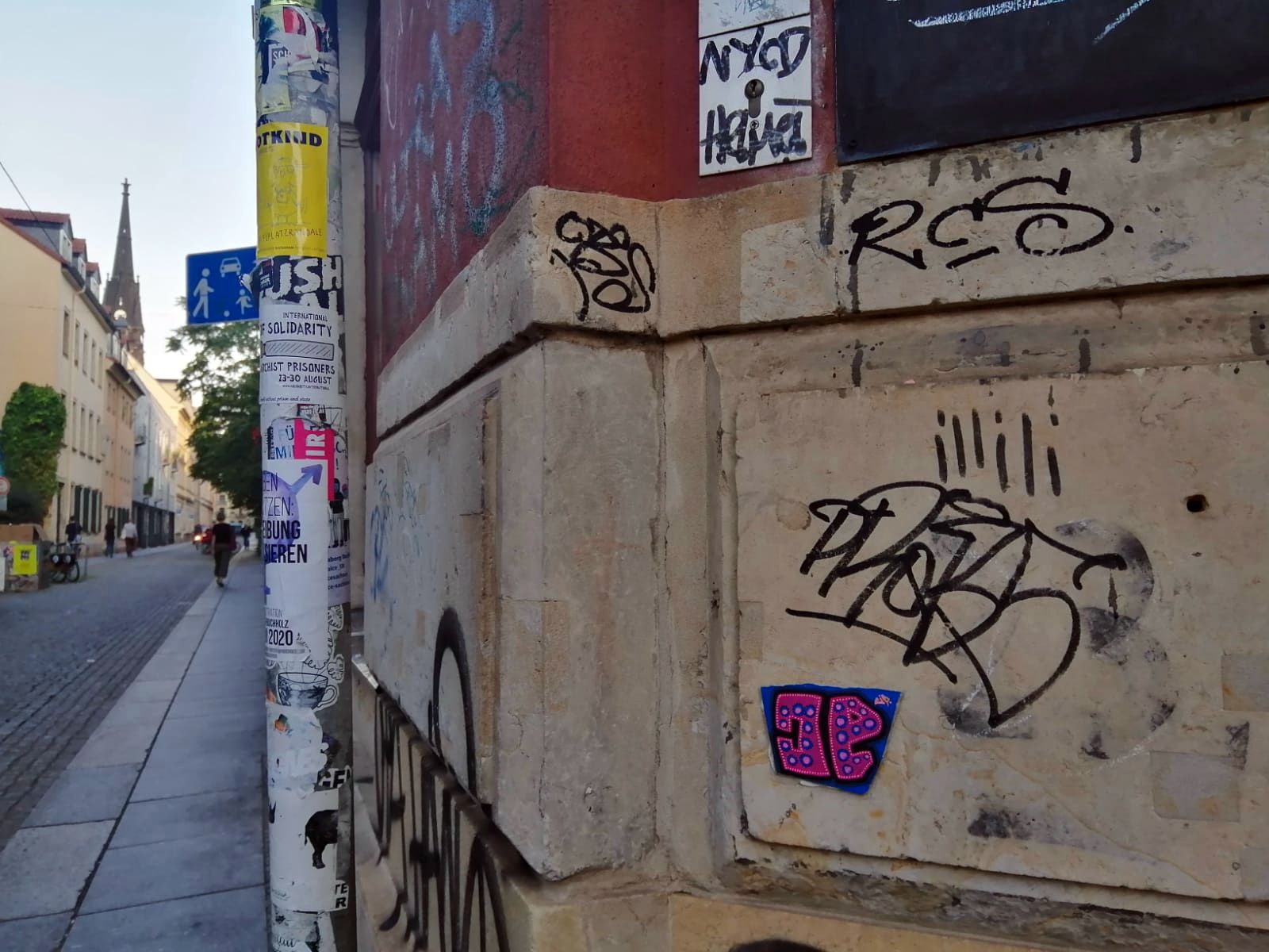 Nachdem wir in der Vorwoche eine Fliese am „Hebedas“ zeigten, schauen wir heute auf die gegenüberliegende Ecke. Hier gibt es nicht ganz so viele Aufkleber, dafür große Werbetafeln für einen berühmten Krimskram-Laden. Die kleine Fliese hier gehört zu den Buchstaben-Fliesen. Davon gibt es unter anderem an der Schiefen Ecke eine. Ob das „JE“ jetzt nur eine Abkürzung für das sonst verwendete Kürzel „JEM“ steht oder eine ganz andere Bedeutung hat, bleibt wohl ein Geheimnis der Künstlerin. Oder war es gar ein Fliesenkünstler?