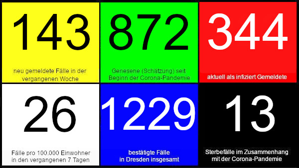 Das Dresdner Gesundheitsamt meldet mit Stand heute 12 Uhr für die vergangene Woche 143 Neuinfektion, die Corona-Ampel steht auf „Gelb“, 16 Personen werden stationär in einem Krankenhaus behandelt. Weltweit sind inzwischen mehr als 39 Millionen Infizierte gemeldet, mehr als 1,1 Millionen Todesfälle wurden in Zusammenhang mit Covid-19 verzeichnet, Details in der Übersicht der Johns-Hopkins-Universität.