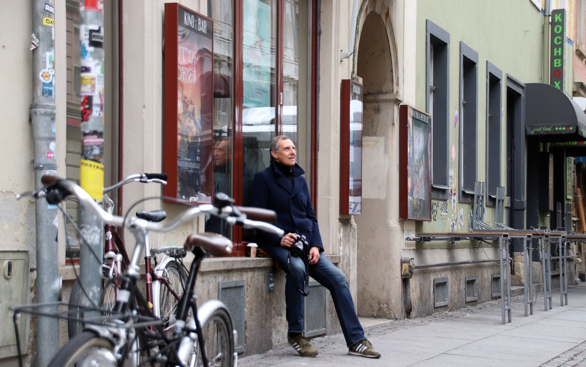 „Hier vorm Thalia zu sitzen und das vielfältige Neustadtleben an mir vorbeiziehen zu lassen, das macht glücklich“, beschreibt er, was für ihn den Reiz am Fotografieren ausmacht. Dabei hat er einen guten Blick auf Details. Als im März die Pappdemonstranten auf der Hauptstraße von der Polizei weggetragen wurden, war er zufällig vor Ort und hielt das Geschehen fest.