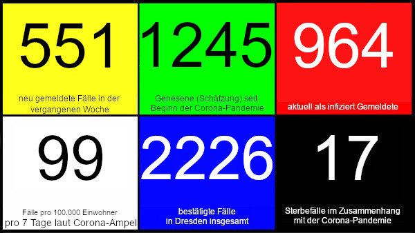 Das Dresdner Gesundheitsamt meldet mit Stand heute 12 Uhr für die vergangene Woche 551 Neuinfektion, die Corona-Ampel steht auf „Rot“, 31 Personen wurden in der vergangenen Woche in ein Krankenhaus aufgenommen. Weltweit sind inzwischen mehr als 46 Millionen Infizierte gemeldet, mehr als 1,1 Millionen Todesfälle wurden in Zusammenhang mit Covid-19 verzeichnet, Details in der Übersicht der Johns-Hopkins-Universität.