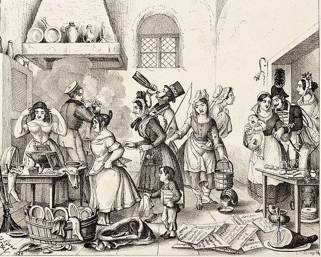 Ein Jäger nähert sich rechts ganz ungeniert der Amme, die den Stammhalter der Herrschaft auf dem Arm hält, ohne Rücksicht auf den selbigen. Der wehrt sich mit lautem Geschrei. Und lange hat die Dame des Hauses vergeblich nach der Jungmagd geklingelt. Doch die Schnur der Schelle ist zerrissen. Die Frau eilt also herzu und wird von der Magd angeraunzt. „Was gibt es denn schon wieder.“ Und unter dem Abstelltisch rechts im Bilde befindet sich ein gut gefüllter Nachttopf, der ob des Rummels in der Küche bereits übergeschwappt ist.