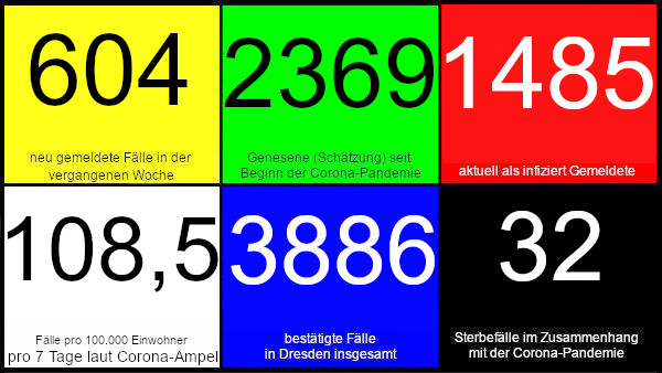 Das Dresdner Gesundheitsamt meldet mit Stand heute 12 Uhr für die vergangene Woche 604 Neuinfektion, die Corona-Ampel steht auf „Rot“, 14 Personen wurden in der vergangenen Woche neu in ein Krankenhaus aufgenommen, acht Personen verstarben laut Totenschein an einer COVID-19-Erkrankung.