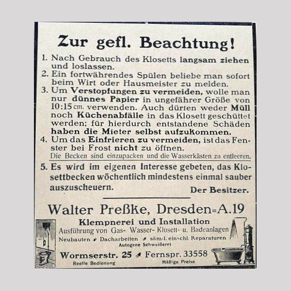 Um die Antwort gleich zu geben: durch Zwang! Diese Ungeheuerlichkeit teilte das Gewerkschaftsorgan Sachsenstimme seinen Lesern am 28. August 1904 mit. Und in der Residenz erhob sich kaum ein Sturm des Unverständnisses. Es gab zwar schon in einigen Hotels, in den Villen der betuchten Oberschicht und bei Königs diese moderne Art der Fäkalienabfuhr. Aber für den Rest, also die absolute Mehrheit der Dresdner, hieß es, zum Geschäft der hinterlistigen Zwecke das Plumpsklo im Hof aufsuchen, bei Tag und Nacht, bei Hitze, Regen, Sturm und strengem Frost.
