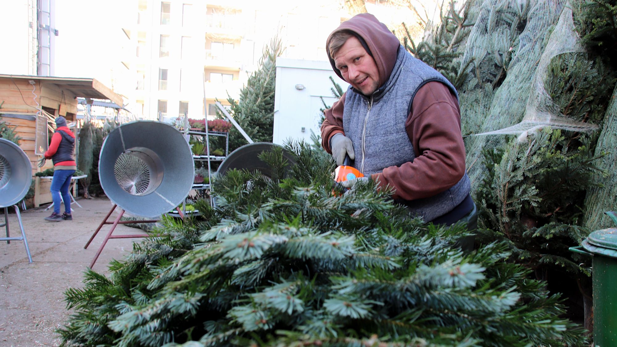Im Alten Heizhaus an der Stetzscher Straße hat am Montag der Weihnachtsbaumverkauf begonnen. Trödelmeister Sven Hellmich huscht geschäftig zwischen den Nordmann-Tannen hin und her. Sein Team hat die vergangenen Tage ordentlich gebuckelt, um einen guten Verkauf zu gewährleisten. „Wir arbeiten in diesem Jahr in zwei Etappen, damit genügend Platz auf dem Hof ist“, sagt Hellmich. So haben die Besucher*innen genügend Platz, um sich in Ruhe den richtigen Weihnachtsbaum auszusuchen. In zwei Wochen wird dann noch einmal aufgefüllt.