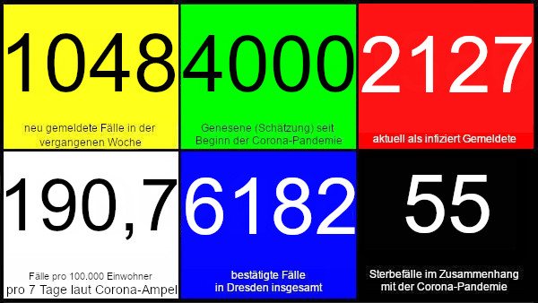 Das Dresdner Gesundheitsamt meldet mit Stand heute 12 Uhr für die vergangene Woche 1048 Neuinfektion, die Corona-Ampel steht auf „Rot“, 26 Personen wurden in der vergangenen Woche neu in ein Krankenhaus aufgenommen, elf Personen verstarben laut Totenschein an einer COVID-19-Erkrankung.