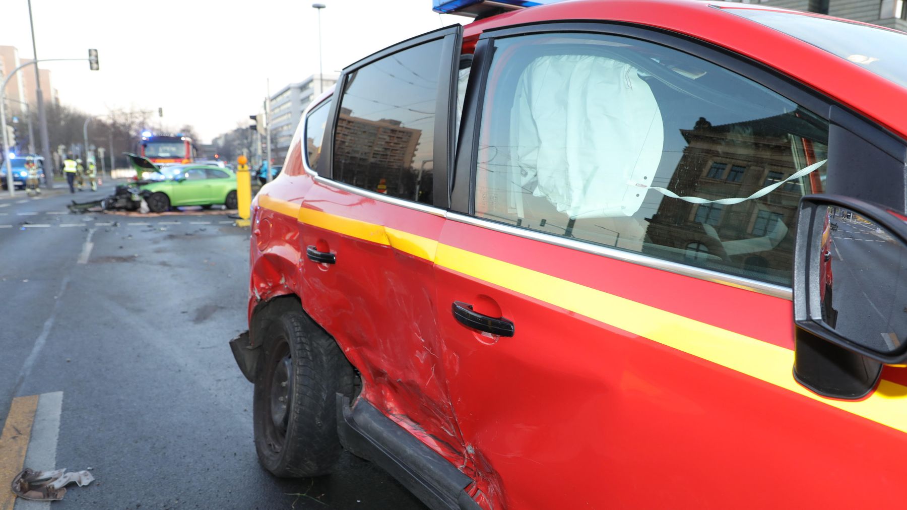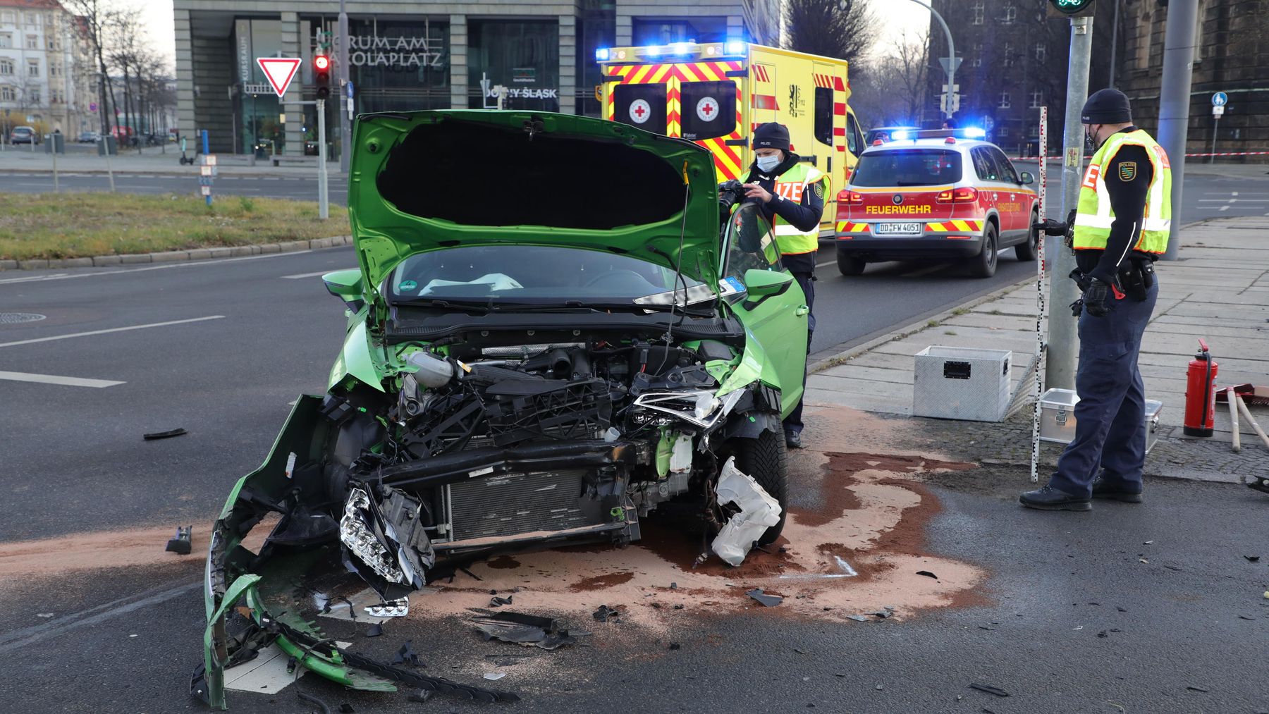 Bei dem Zusammenstoß wurden zwei Personen verletzt, die 25-jährige Fahrerin des Seat und der 51-jährige Beifahrer in dem Führungsfahrzeug der Feuerwehr. Die Feuerwehr unterbrach die Einsatzfahrt und sicherte die Unfallstelle ab. Zwei Rettungswagen brachten die Verletzten ins Krankenhaus. Die Feuerwehr kümmerte sich direkt vor Ort um ausgelaufene Betriebsmittel. Für den PKW-Verkehr war der Carolaplatz in Richtung Brücke bis etwa 9 Uhr gesperrt. An den Fahrzeugen entstand ein Sachschaden in Höhe von rund 15.000 Euro.