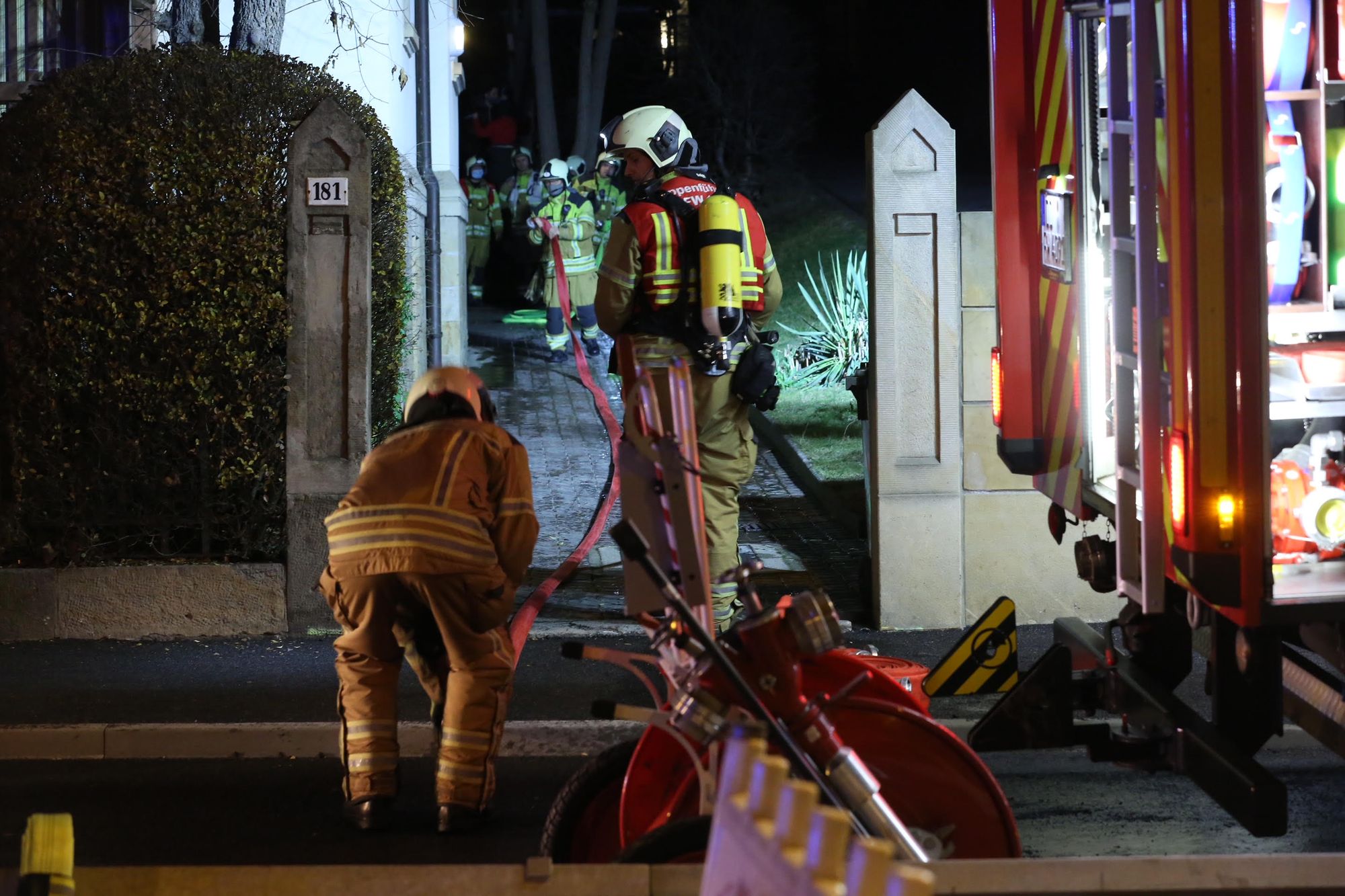Die Anfahrt gestaltete sich für die Einsatzkräfte schwierig, da zunächst Absperrelemente beiseite geräumt werden mussten, um zum Brandobjekt zu gelangen.