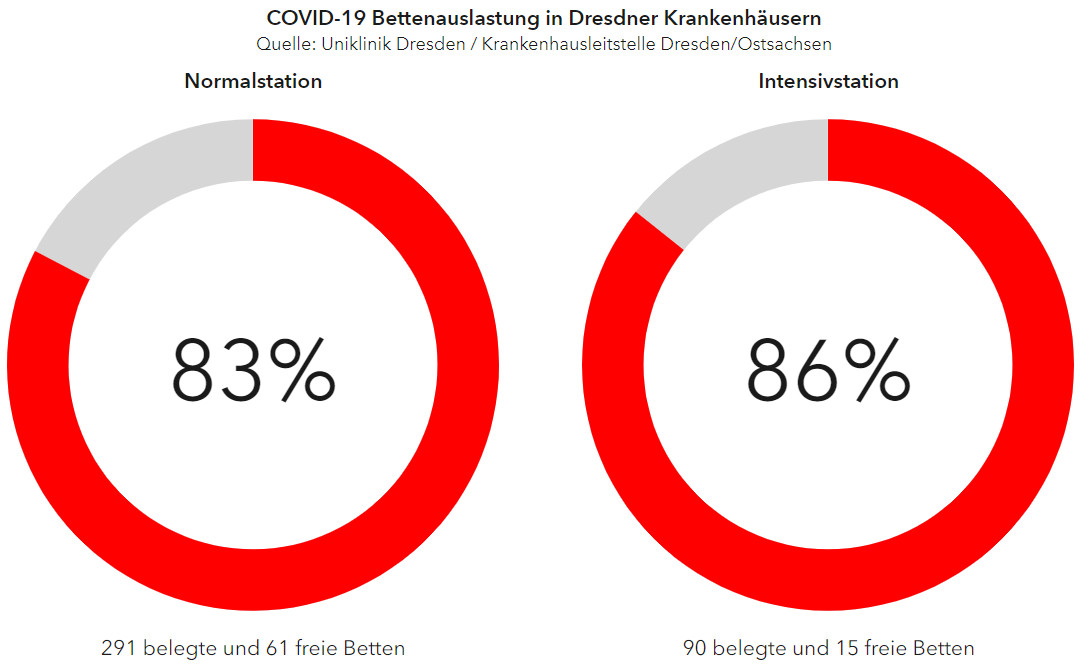 In der vergangenen Woche wurden 50 Covid-19-Patienten neu in Dresdner Krankenhäuser aufgenommen. Insgesamt wurden seit Ausbruch der Pandemie in Dresden 829 Patienten stationär behandelt. Laut DIVI-Intensivregister werden in Dresden 82 Covid-19-Patienten auf Intensivstationen behandelt, davon werden 53 Patienten invasiv beatmet. Aktuell sind nach diesem Register in Dresden noch 28 Intensiv-Betten frei.