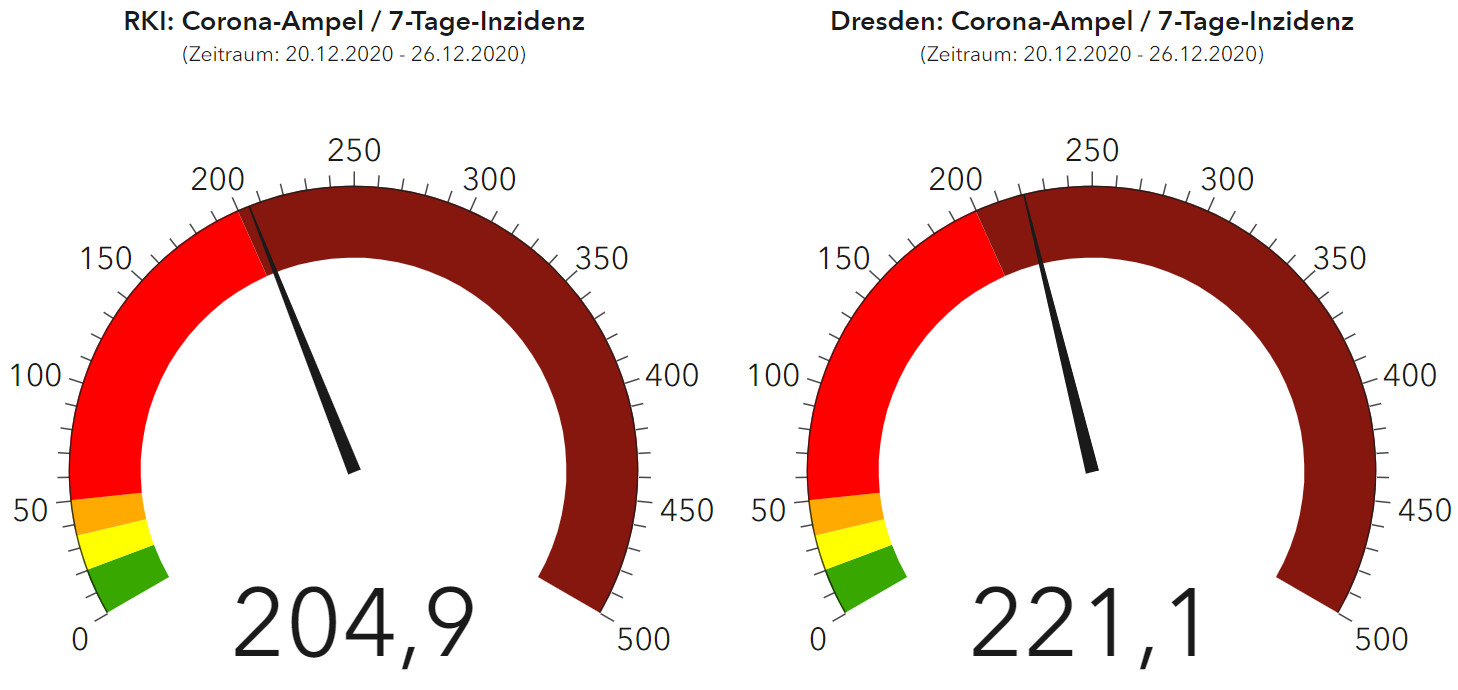 Die Stadtverwaltung zeigt auf dresden.de seit Anfang Dezember gleich zwei Corona-Ampeln. Die eine zeigt das aktuelle Infektionsgeschehen, wie es beim Gesundheitsamt gemeldet wird an, die andere den Stand des RKI. Die RKI-Ampel ist für eventuelle Einschränkungen wichtig. Die RKI-Ampel ist in den vergangenen Wochen immer geringer ausgefallen als die Ampel vom Gesundheitsamt. Angezeigt wird jeweils, wie viele Fälle es pro 100.000 Einwohner in Dresden in den vergangenen sieben Tagen gab.