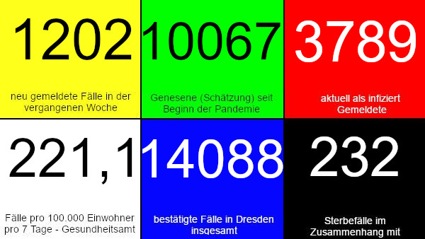 Die Corona-Ampel des Dresdner Gesundheitsamtes zeigt immer die letzten sieben Tage an. Also heute vom vergangenen Sonntag bis Sonnabend. Am Sonntag, dem 27. Dezember 2020 zeigte die Ampel weiterhin auf dunkelrot mit einer 7-Tage-Inzidenz von 221,1. 41 Personen sind laut Totenschein in der vergangenen Woche an einer Covid-19-Erkrankung verstorben, offenbar wurden 4 frühere Todesfälle nachgemeldet. Insgesamt werden in Dresden nun 232 Todesfälle im Zusammenhang mit Covid-19 verzeichnet.