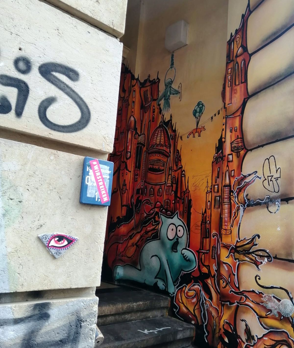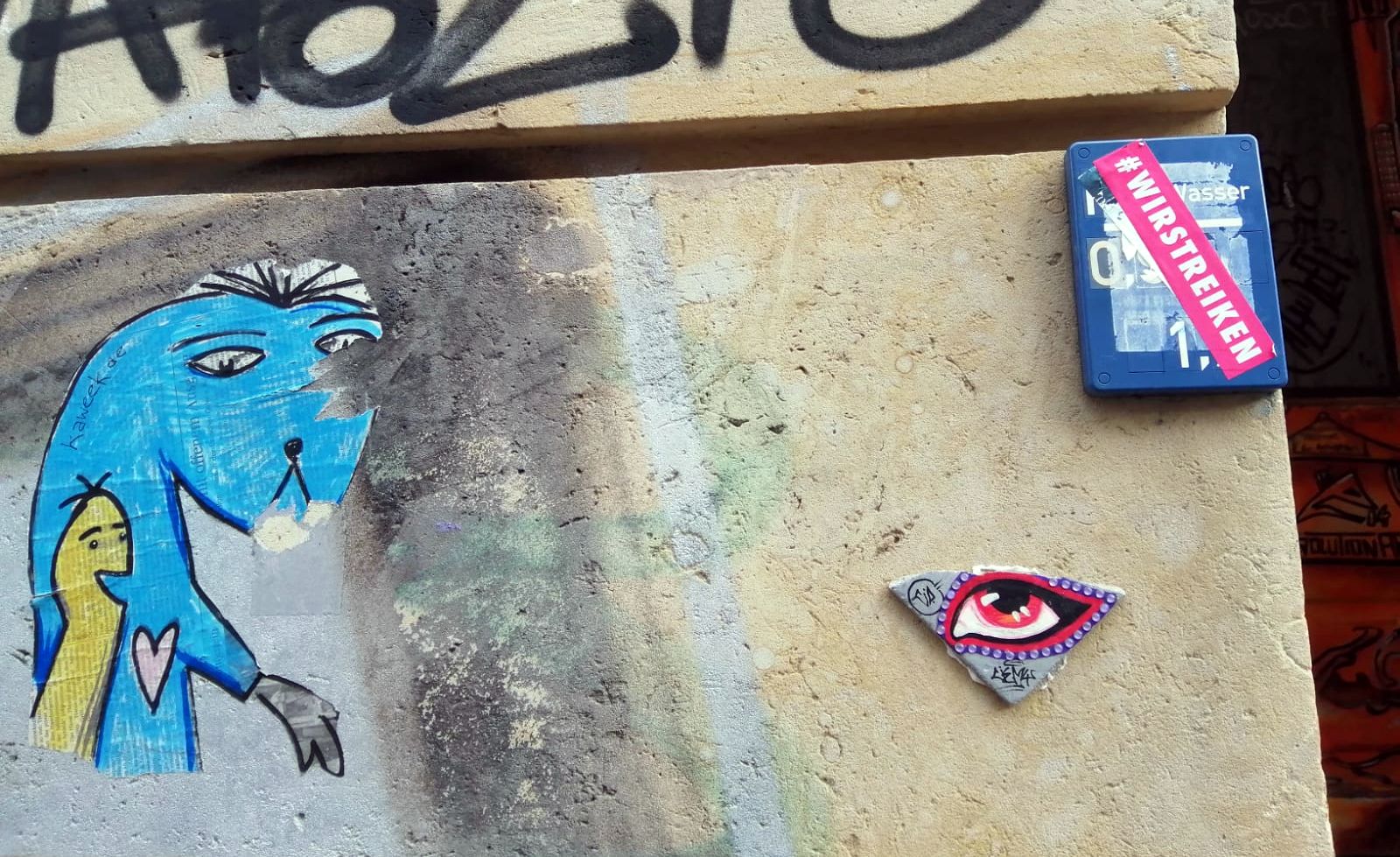 Am oberen Ende der Alaunstraße, kurz vor der Kreuzung zur Sebnitzer Straße wacht dieses Auge. Gleichzeitig wird das Auge noch von zwei weiteren Figuren überwacht. Neben dem Äuglein befindet sich seit sechs Jahren einer der schönsten Hauseingänge der Neustadt. Kunterbunt mit dicker Katze, gestaltet vom Künstler Evolution Artone und inzwischen schon ein beliebter Insta-Spot.