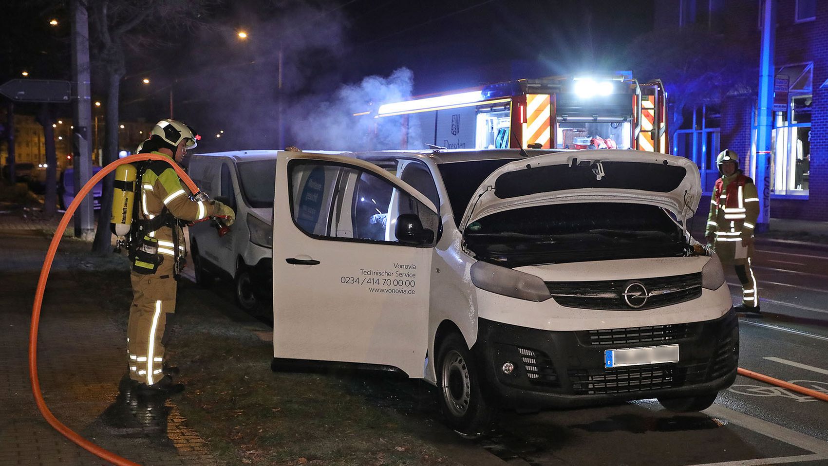 Polizeibeamte bemerkten das Feuer kurz vor 2 Uhr während einer Streifenfahrt und verständigten die Feuerwehr. Offenbar hatten Unbekannte die Seitenscheibe des Opel Vivaro eingeschlagen und den Wagen im Inneren angezündet. Die Kriminalpolizei hat die Ermittlungen zum Brand aufgenommen. Der Schaden kann noch nicht beziffert werden.