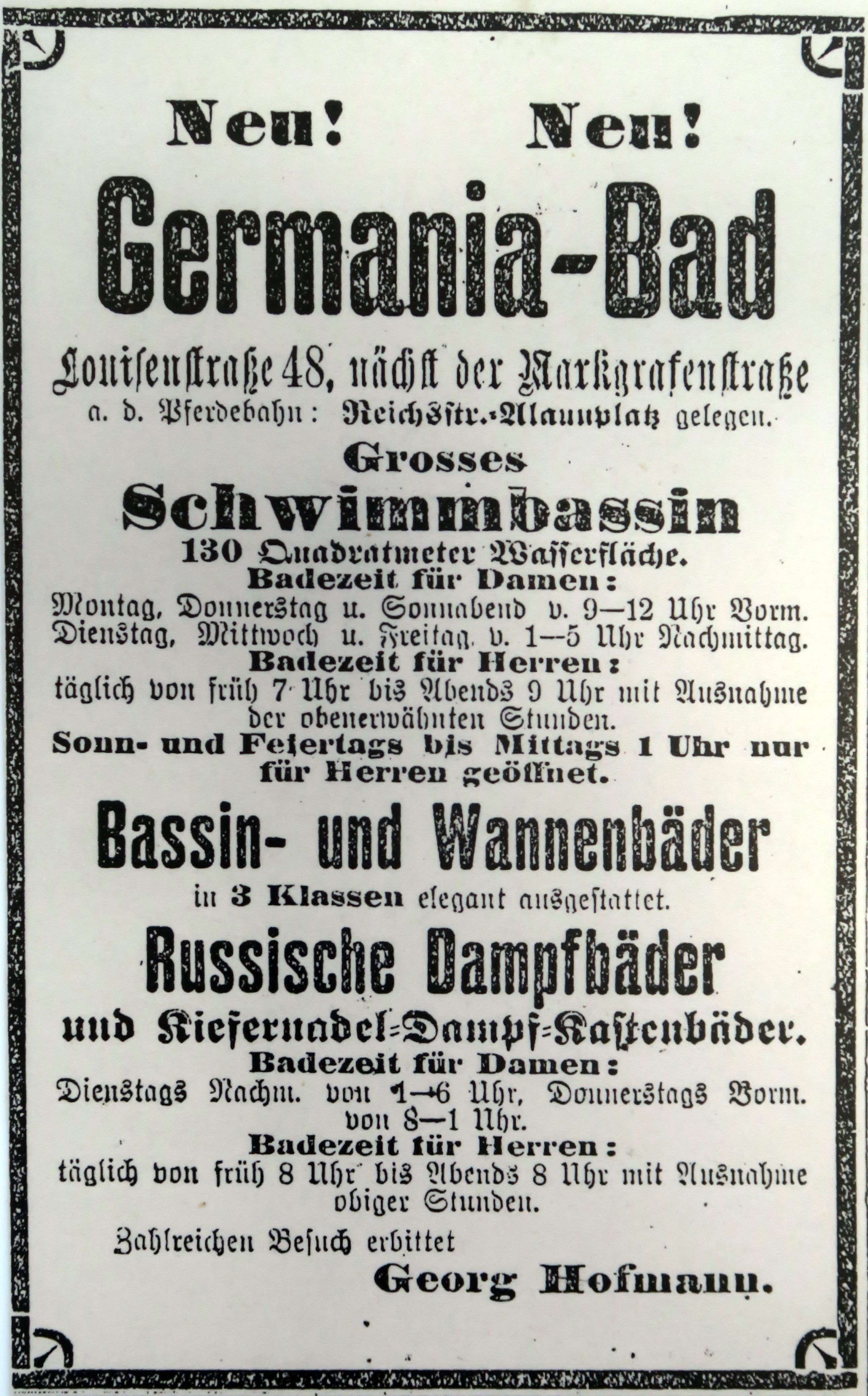 Im März 1895 wurde es als Germania-Bad eröffnet. Damals gab es für Männer und Frauen noch getrennte Badezeiten, und die Bassins und Wannenbäder waren in verschiedene Klassen aufgeteilt.