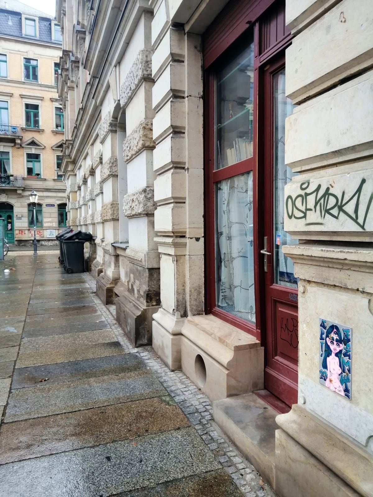Direkt neben dem ehemaligen Un-Kraut, einem kleinen Kräuterladen am Martin-Luther-Platz hat Jemy diese dreiäugige Nackte platziert. Jemy oder Jem scheint ein sehr aktiv zu sein. Unzählige Fliesen hängen an den Wänden der Neustadt, in unserer wohl endlosen Serie haben wir auch schon einige vorgestellt.