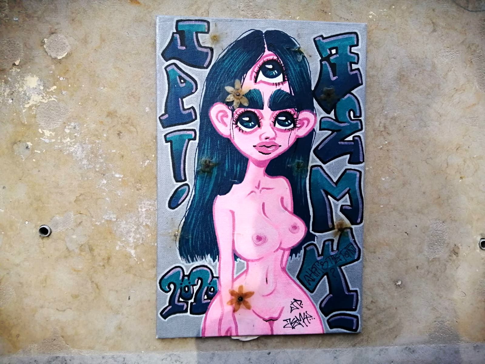 Auch die Dreiäugige ist uns schon über den Weg gelaufen. Da war der Busen jedoch nur angedeutet, direkt neben der Kirche hielt es Jemy wohl für angebracht, mal einen Akt an die Wand zu kleben.
