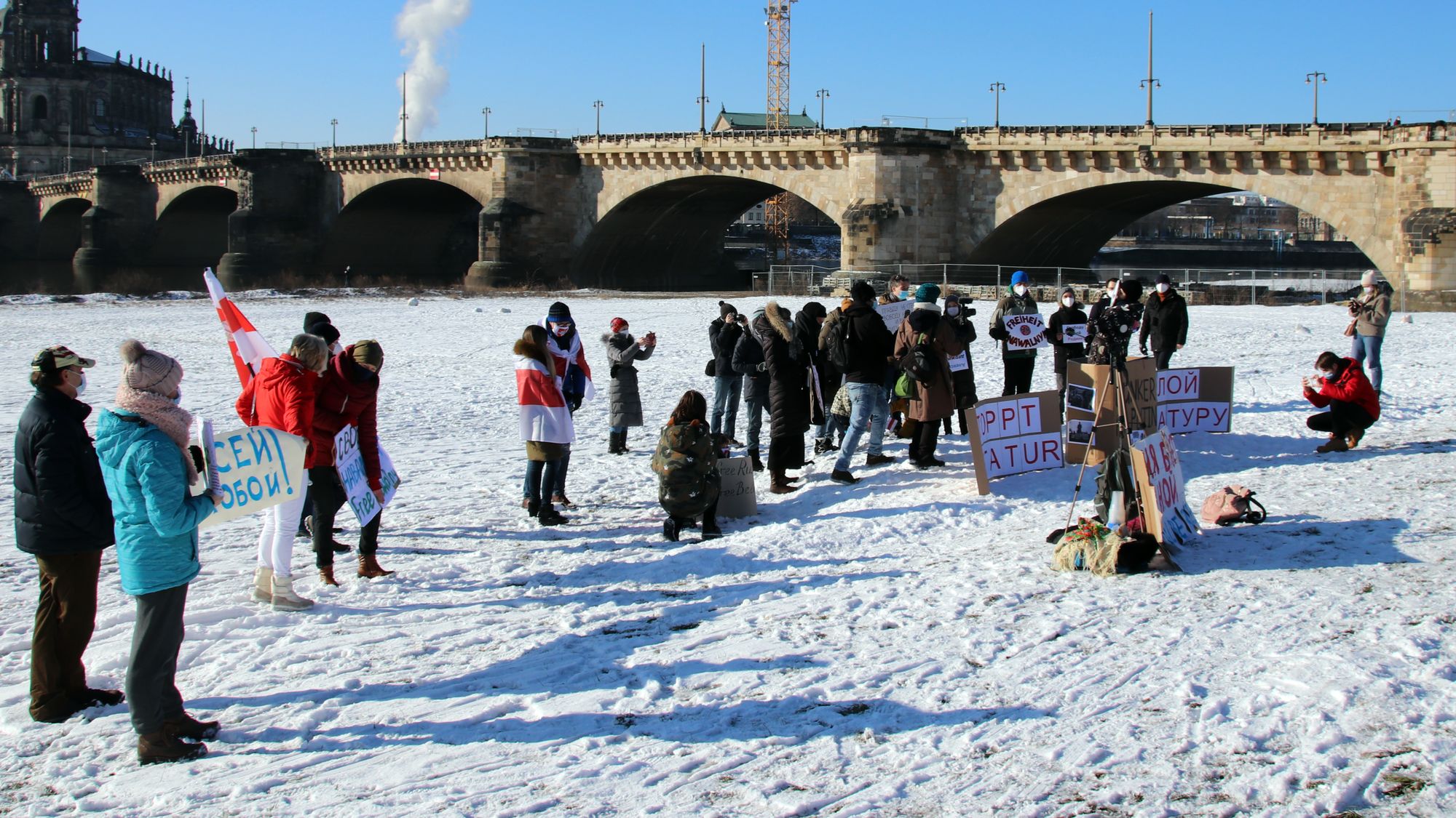 Heute Vormittag fand am Elbufer in der Nähe der Augustusbrücke eine kleine Demonstration statt. Rund 30 Teilnehmende riefen auf deutsch und russisch Losungen. Sie forderten unter anderem „Freiheit für Nawalny“ und ein „Stopp der Diktatur“ in Russland.